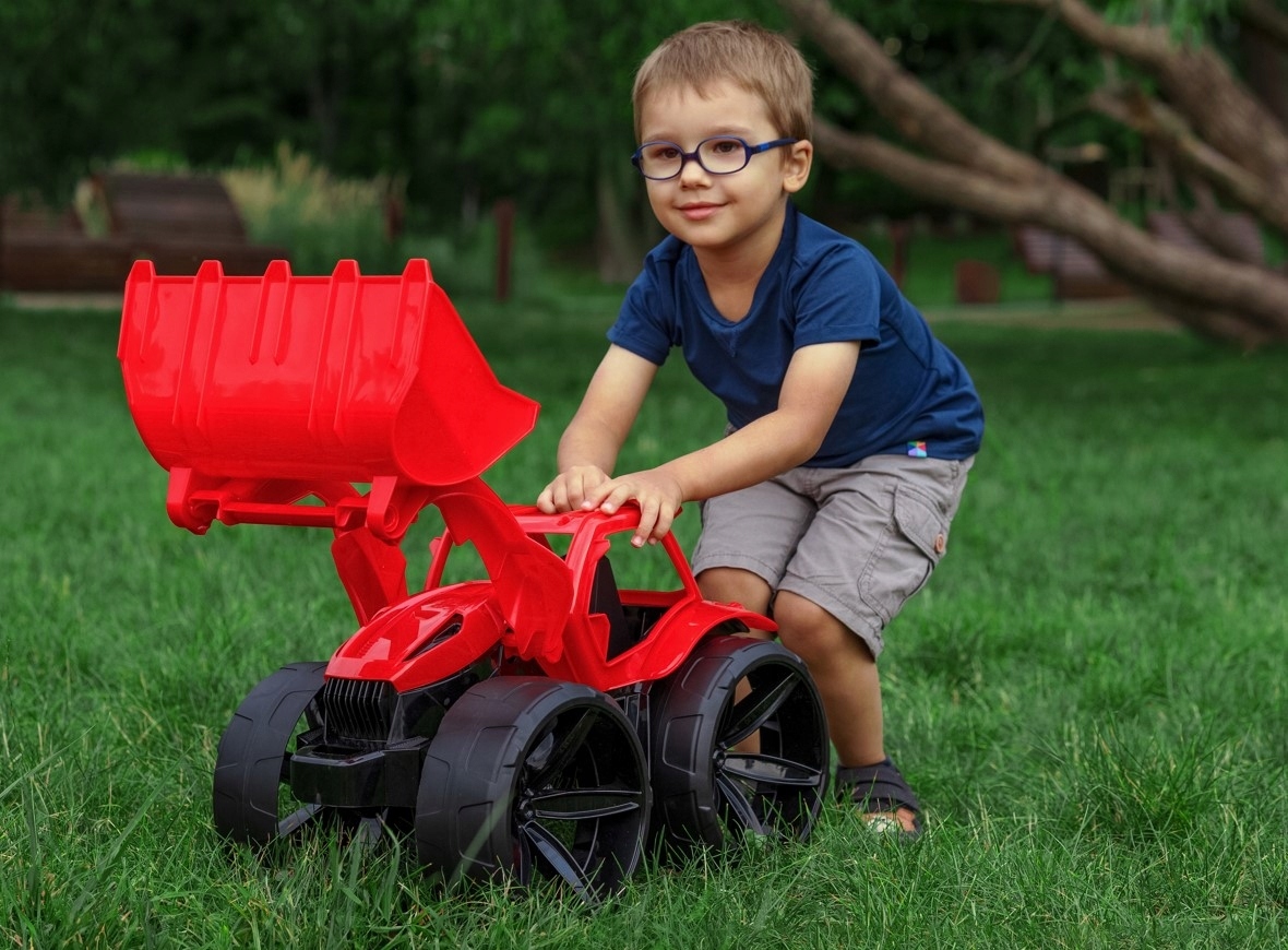 Бульдозер MAXIMUS сочного красного цвета отличает: современный дизайн, прочная, легкая конструкция, современная линия кузова с большими матовыми колесами и красивой отделкой деталей. Кроме того, он имеет подвижные элементы, такие как большие матовые колеса, бульдозерную стрелу и ковш, которые позволяют разнообразно и реалистично развлечься как дома, на песке, так и в саду. Сырье, из которого изготовлены автомобили Maximus, устойчиво к погодным условиям.Длина автомобиля составляет 68 см.