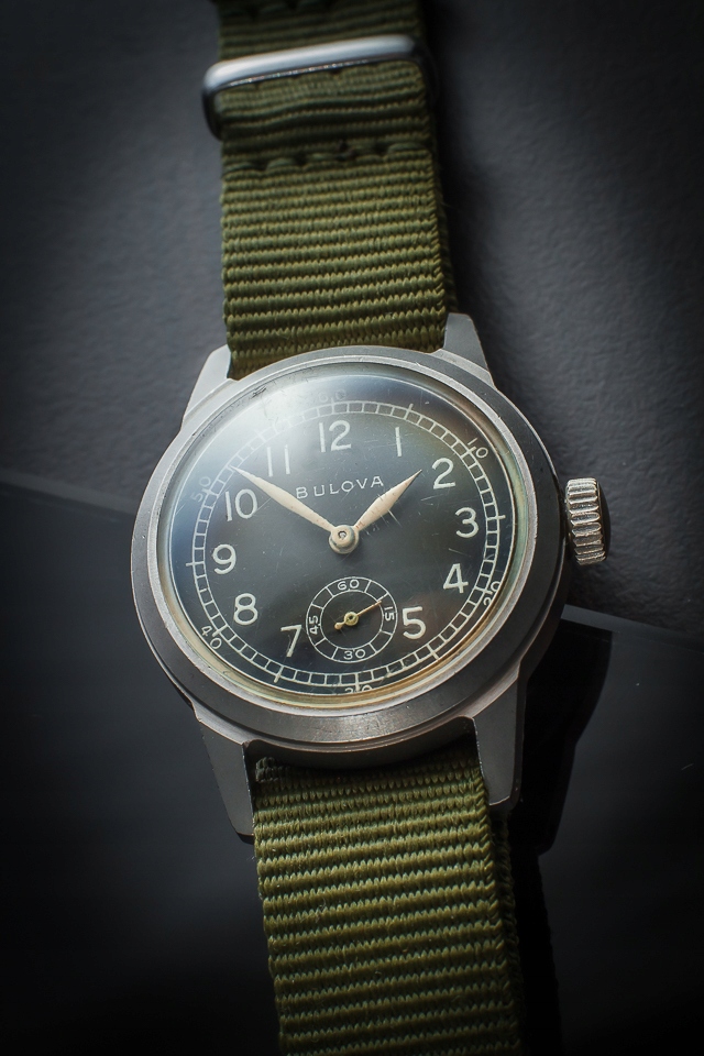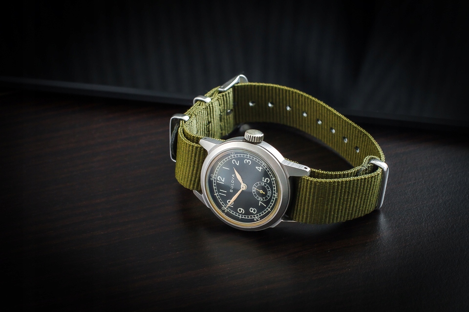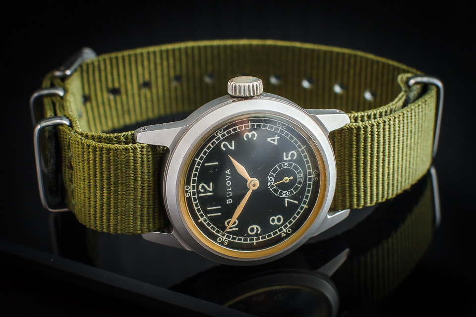черный. Подпись торговой марки Bulova с индексами, стрелками и маленькой секундной стрелкой.
