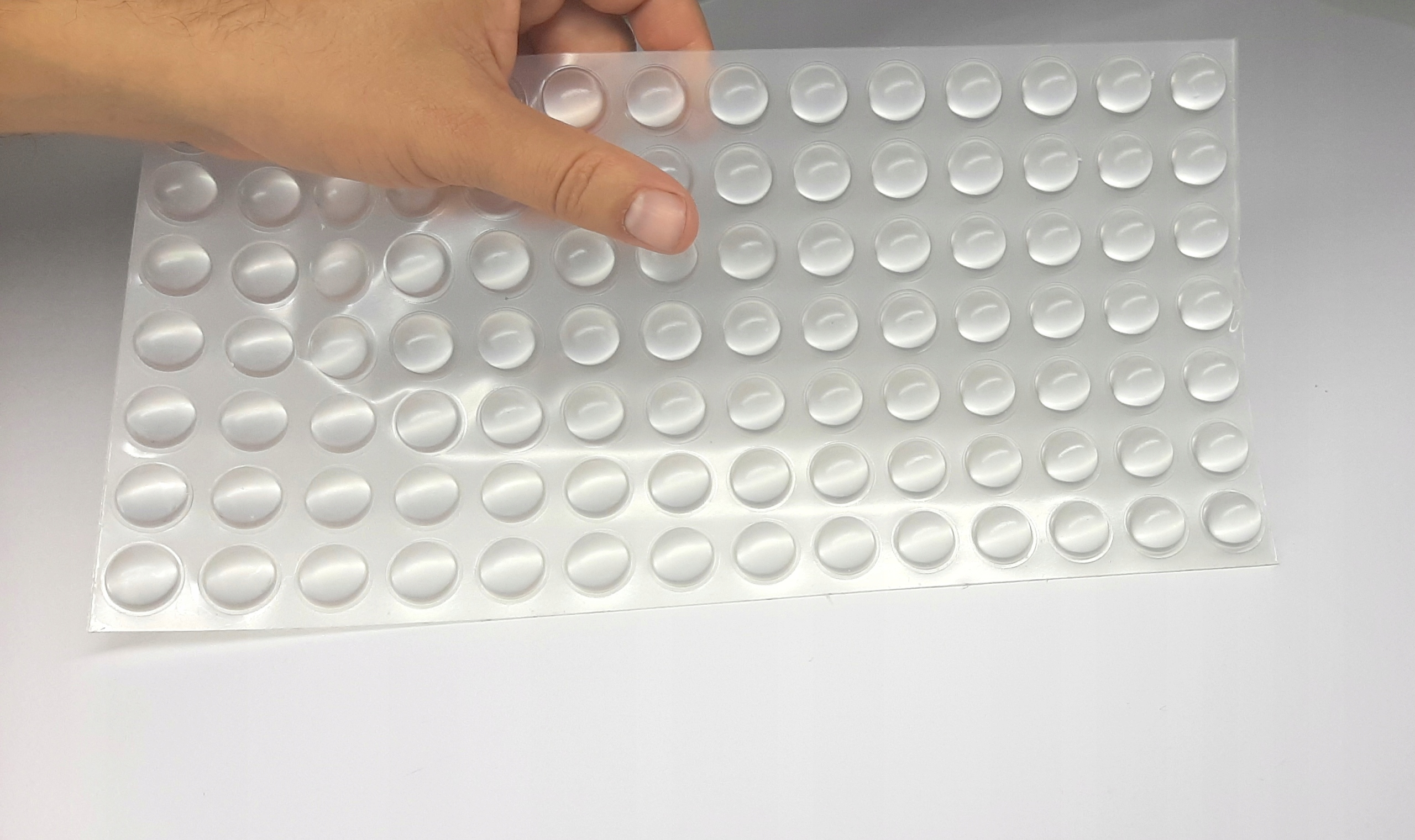 Такие ножки еще называют бортиками, подставками или точками. Они изготовлены из полиуретана и покрыты с одной стороны высококачественным акриловым клеем. Они устойчивы к УФ-излучению. Их используют в качестве прокладок или бамперов в рекламе, производстве мебели, автомобилестроения и электроники.