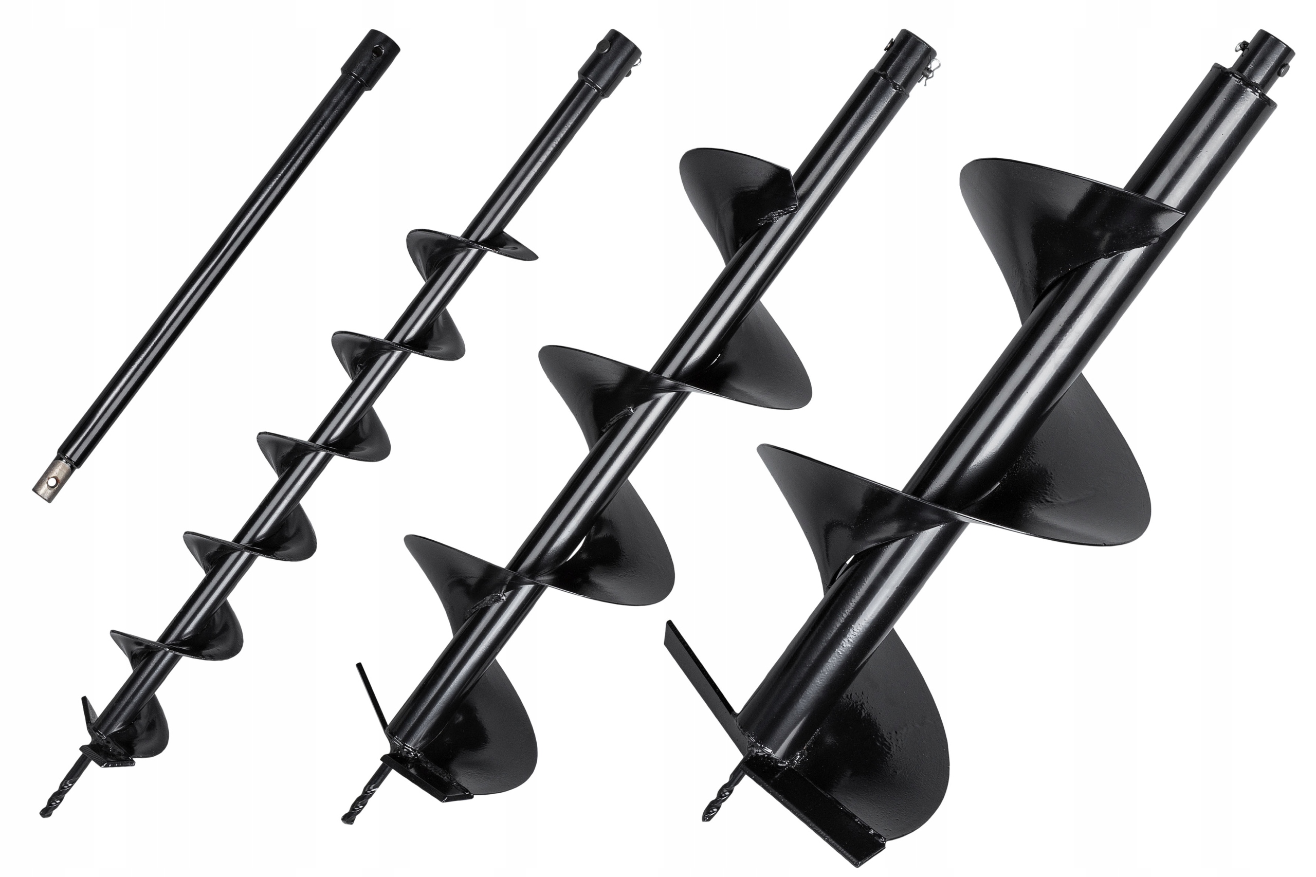 В комплект входят 3 сверла длиной 80 см и диаметром 10, 20 и 30 см. В комплект также входит удлинитель на 50 см.