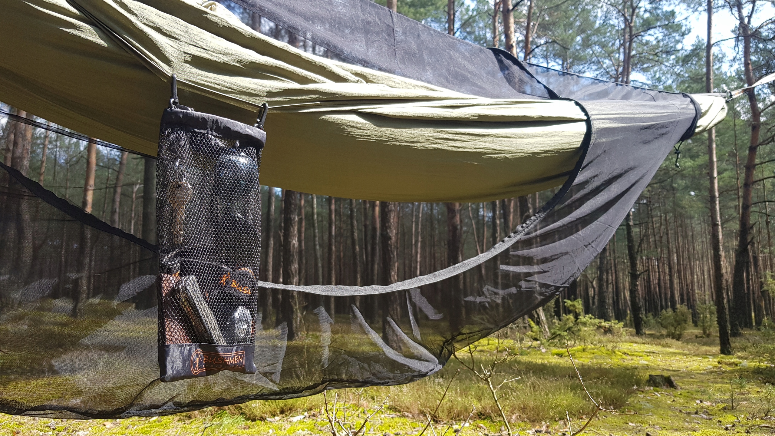 Комплект JUNGLE Long Hammock полностью спрятан в просторной сумке с москитной сеткой. Собирая кемпинг, положите внутрь москитную сетку с гамаком, а сверху УДОБНЫЙ карман с ремнями и карабинами внутри.