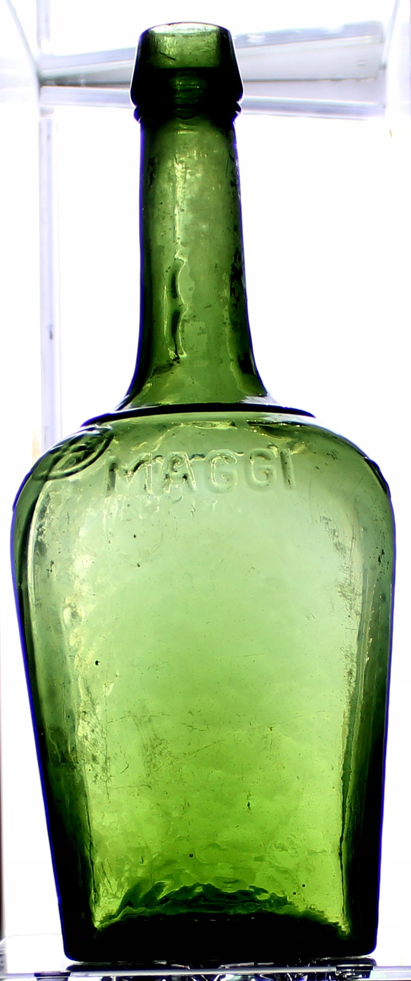 Флакон из зеленого стекла, прозрачность 70%, без трещин, царапин и дефектов. Внешние поверхности гладкие и чистые, без потускнений, с очень небольшим количеством неглубоких потертостей и царапин. Внутри молочный налет, возможно, требуется чистка. Спереди, на боковом крае под горловиной факсимиле Магги. Высота 27,5 см.