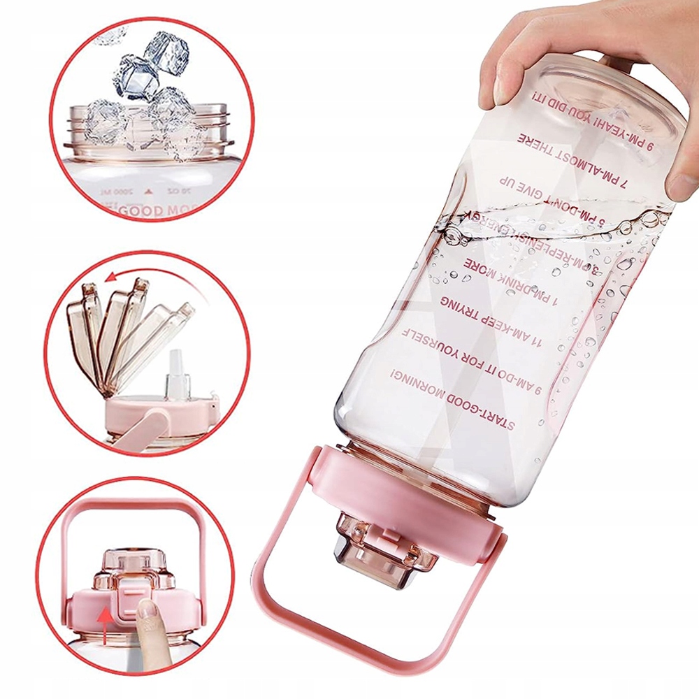 Добро пожаловать в нашу новую линейку бутылок для воды, полезных для здоровья! Бутылка для воды объемом 2 л оснащена инновационной выдвижной соломинкой, которая удобна и быстра, позволяя мгновенно получить доступ к источнику освежения. Кроме того, наша бутылка для воды на 100 % герметична и оснащена улучшенной крышкой, поэтому ее можно брать с собой в дорогу, в спортзал или в дорогу.