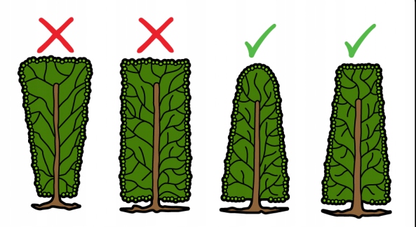 Изгородь из самшита мы подрезаем под углом (первые две фотографии справа отмечены зеленой галочкой вверху) почему - потому что растение, стоящее вертикально, нужно подрезать под углом, чтобы свет доходил повсюду, иначе он не везде будет так хорошо развиваться, у него будет меньше листьев внизу.
