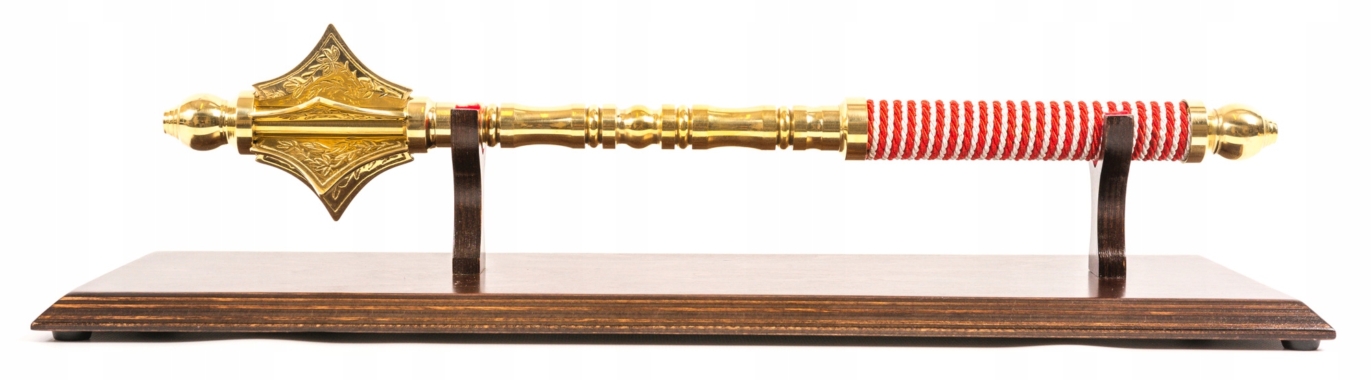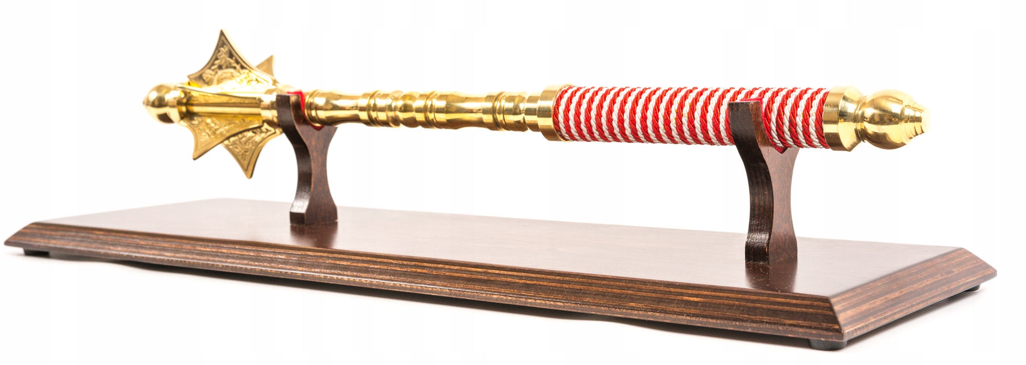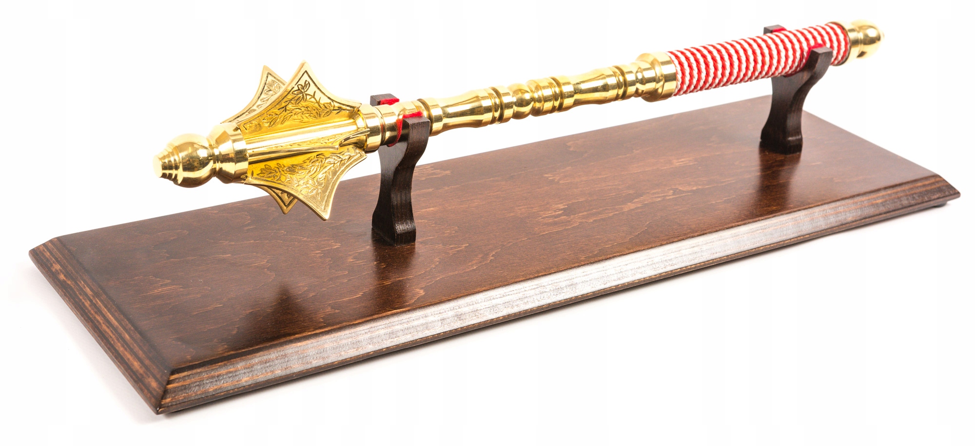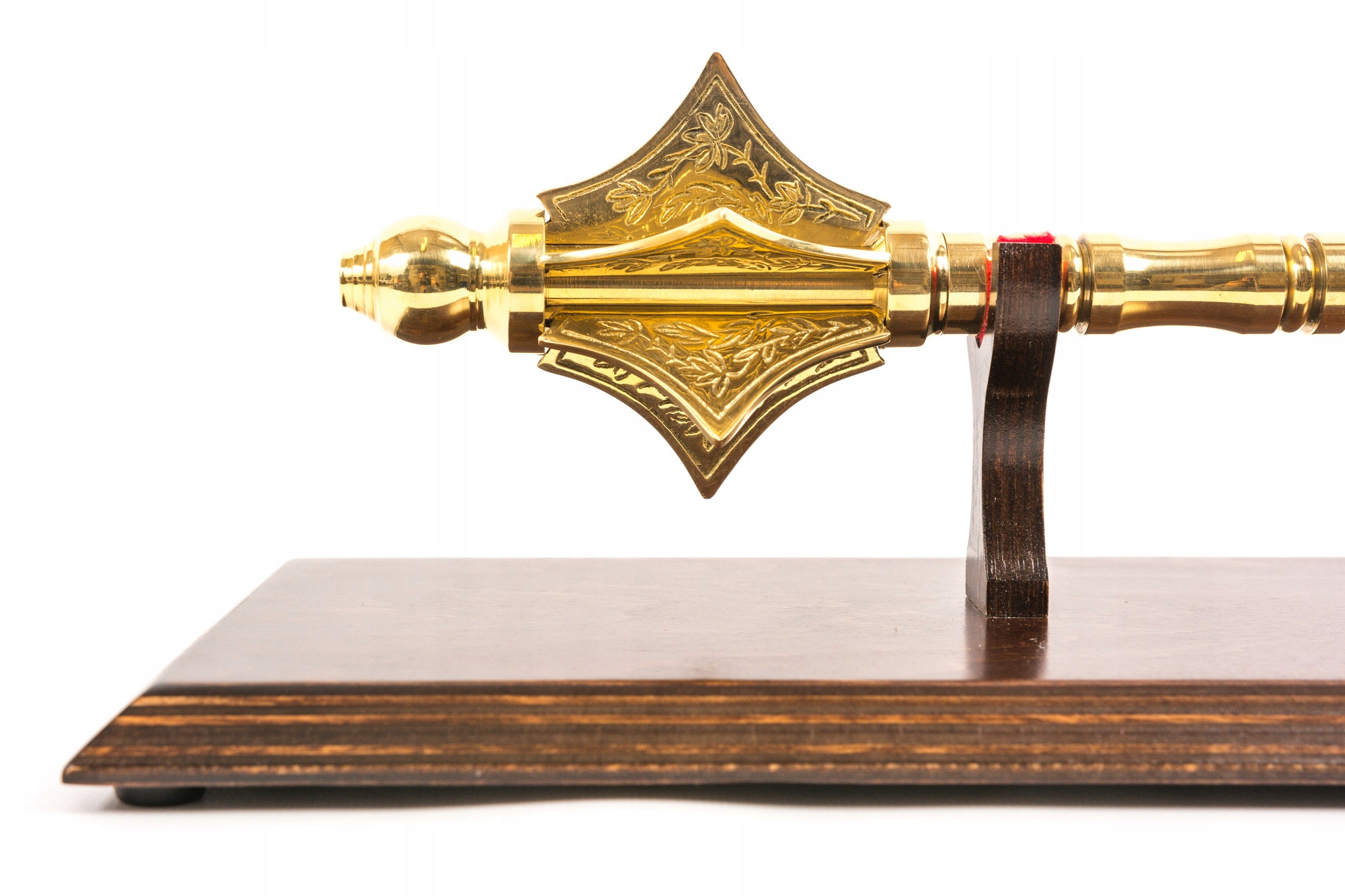 buzdygan - Восточное оружие, металлическая головка, встроенная на ручку. Голова была построена от 6 до 20 перьев. Буздиганы использовались в Европе с 10 до 15 -го века, как через пехоту, так и в ходе вождения, в Польше с 16 по 18 -го века, это было признаком силы капитанов, полковников, подполковников и прапорщика - они обычно были богато украшены, с округлыми перьями. Латунь, в комплекте с деревянной подставкой. Польский продукт-мы поддерживали польские поделки. Голова изготовлена из 6 медных перьев - звездных скрученных элементов. Весь внешний вид, как и знака власти, величественна. Окрашен в высокий блеск и лакирован.