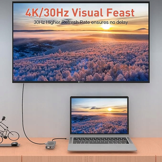 - 【Выход 4K HD】 Эта док-станция имеет один выход HDMI (4K 3840 x 2160 при 30 Гц) и выход VGA (1920 x 1080 при 30 Гц) 60 Гц). С помощью этого адаптера USB C вы можете перенести изображение с компьютера/планшета/смартфона на телевизор, монитор или проектор. Одновременное использование HDMI и VGA приведет к отображению одного и того же изображения. Напоминание: для обеспечения превосходной производительности подавайте питание на концентратор от порта PD при использовании HDMI или VGA.