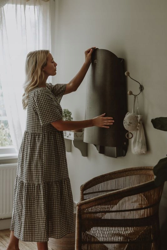 Его можно закрепить на стене на любой высоте. В сложенном виде он занимает очень мало места и очень практичен. Это интересное решение, особенно для молодых родителей, живущих в небольших квартирах, где важен каждый кусочек пространства. Две полочки - дополнительное удобство - на них можно положить кремы, увлажняющие салфетки, масла - все, что необходимо для ухода за малышом.
