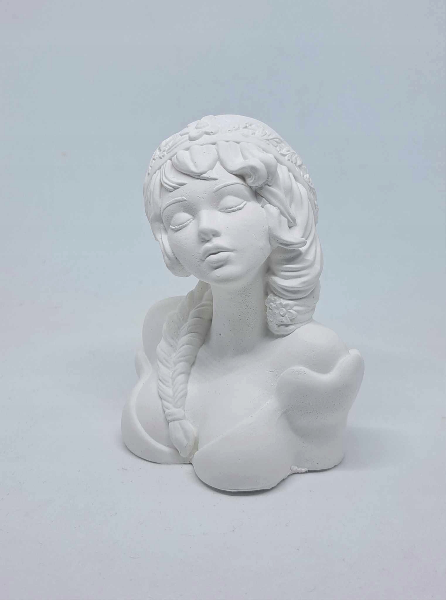 Бюст будет на ваших руках белым тропой, не волнуйтесь! Это не указывает на плохую производительность или использование низкого качества гипса. Напротив - это означает, что бюст был отполирован для вас, так что он совершенно гладкий и не имеет микроэтаж.