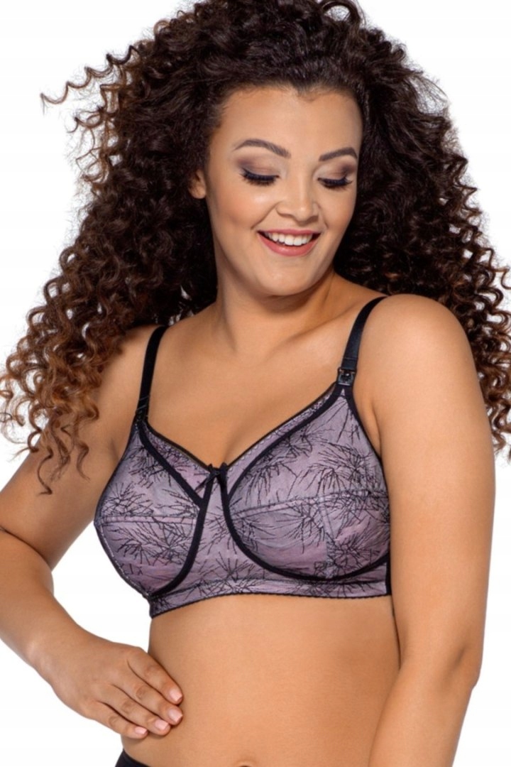 Выполнен из хлопка нежно-розового цвета с отделкой светло-черным плейном с абстрактным узором. Бюстгальтер идеально поддерживает грудь, а расширенный обхват надежно удерживает ее в нужном месте. Удобные клипсы, облегчающие быстрое отстегивание чашки, украшены очаровательной графикой в виде детской соски, которая идеально отражает функциональность бюстгальтера.