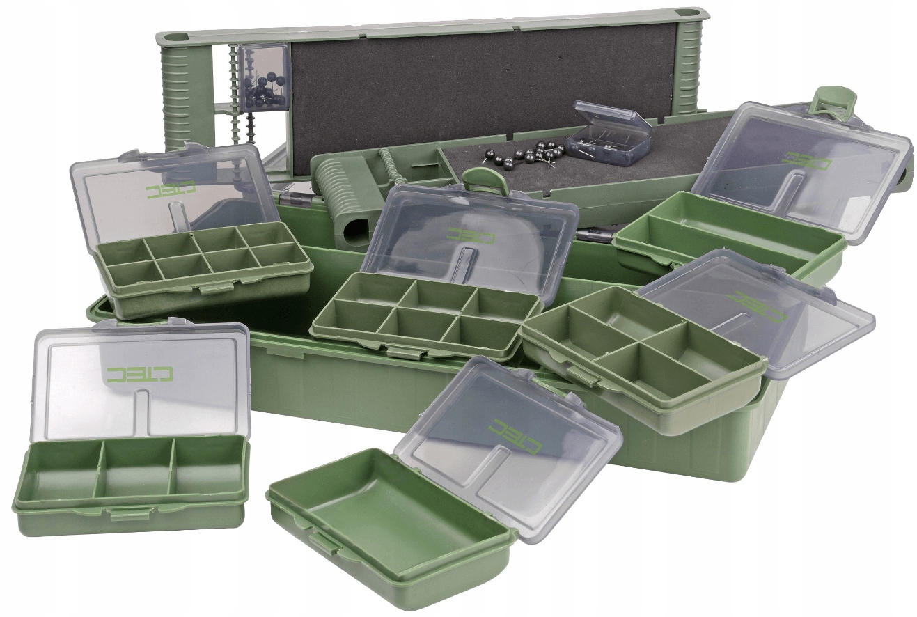 Полная коробка для снастей, включая 2 пенала для поводков и 6 коробок меньшего размера для аксессуаров.