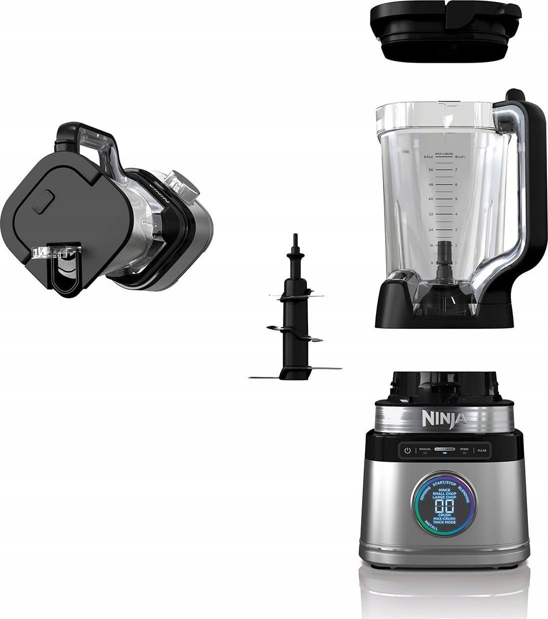 Ninja Detect Power Mixer Pro. Модель: табличный блендер, Цвет продукта: черный, серебро, длина кабеля: 0,8 м. Пропускная способность чаши: 2,1 л, регулировка скорости: ступенчатая лестница, тип управления: кнопки, ротари. Материал для корпуса: пластик, лезвия материал: нержавеющая сталь. Питание: 1200 Вт, источник питания: переменный ток. Ширина продукта: 212 мм, глубина продукта: 174 мм, высота продукта: 445 мм