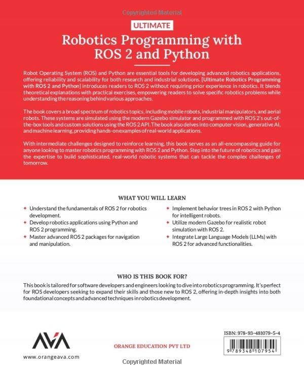 Учитесь робототехникой и ROS 2 с практическими примерами Описание книги Операционная система робота (ROS) и Python являются важными инструментами для разработки приложений передового робототехники, обеспечения надежности и Scala -Scalability как для исследовательских, так и для промышленных решений. [Ultimate Robotics Programming с ROS 2 и Python] знакомит читателей с ROS 2, не требуя предварительного опыта в робототехнике. Он сочетает в себе теоретические объяснения с практическими упражнениями, позволяя читателям решать конкретные проблемы робототехники, одновременно понимая рассуждения, лежащие в основе различных подходов. Книга охватывает широкий спектр темах робототехники, в том числе мобильные роботы, промышленные манипуляторы и воздушные роботы. Эти системы моделируются с использованием современного симулятора беседки и запрограммированы с помощью ROS 2 инструментов и пользовательских решений с использованием API ROS 2. Книга также углубляется в компьютерное зрение, генеративное ИИ и машинное обучение, предоставляя практические примеры реальных приложений. Таблица контента 1. Введение в операционную систему 2 робота 2 2. Практическое программирование ROS 2 с использованием Python 3. Дополнительные инструменты для ROS 2 4. Визуализация и моделирование робота 5. Написание тестов с использованием pytest для узлов ROS 2 6. Контроль перевернутого маятника с помощью PID -контроллера 7. Освобождение от остара на основе лазерной основы с помощью мобильного робота на колесах 8. ros 2 поведения деревьев с использованием python 9. Система наблюдения с использованием поведенческих деревьев 10. Навигация по роботам с использованием навигационного стека ROS 2 (NAV2) 11. Управление рулем робота с использованием Moveit 2 12. Программирование воздушных роботов с использованием ROS 2 13. Компьютерное зрение с использованием ROS 2 14. Обнаружение объекта с использованием ROS 2 15. Использование больших языковых моделей с ROS 2 16. Глубокое обучение подкреплению с использованием ROS 2 Индекс