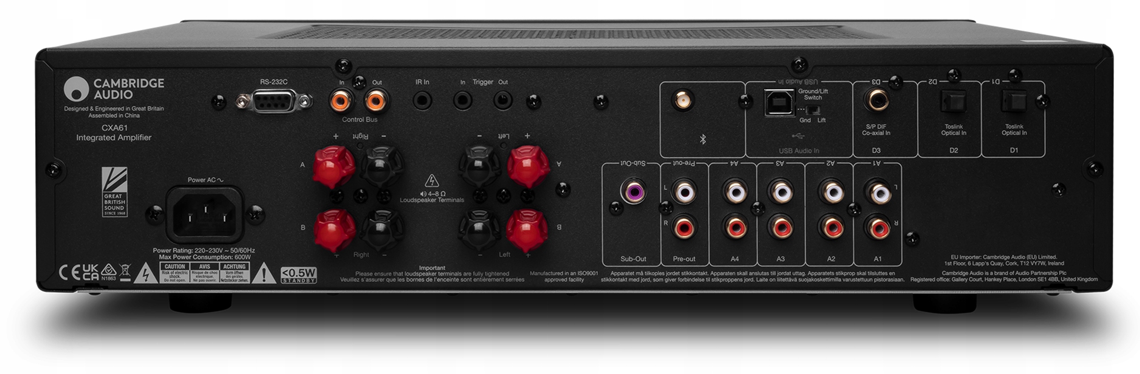 На плате установлен новый цифро-аналоговый преобразователь ESS Sabre SE9010K2M, питающий два оптических входа (24 бит/96 кГц) и коаксиальный вход (24 бит/192 кГц) – оба уже присутствуют в CXA60. . Однако на этот раз имеется также вход USB (32-бит/384 кГц PCM и DSD256), а также триггерные входы RS232 и 12 В.