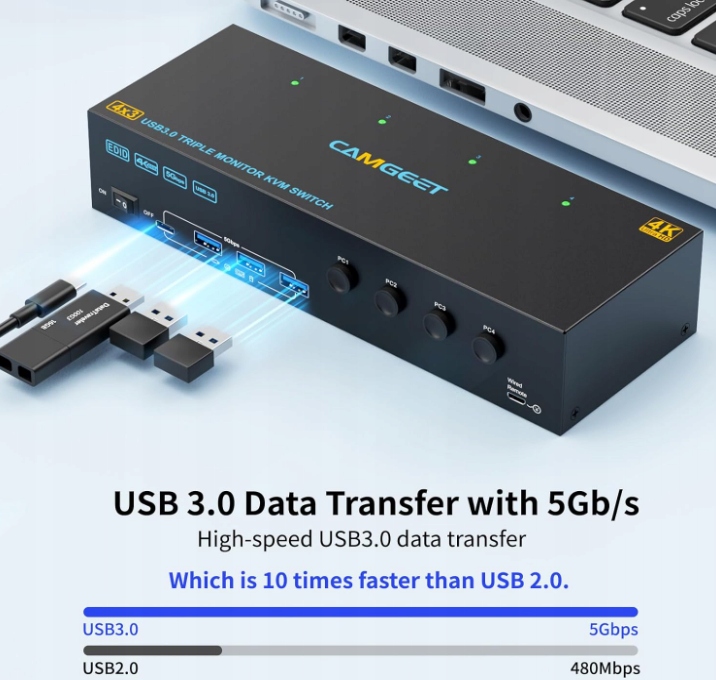 KVM-переключатель Camgeet KVM403DH2 — 3 монитора, 4 компьютера, 4 порта USB 3.0, 4K@60 Гц