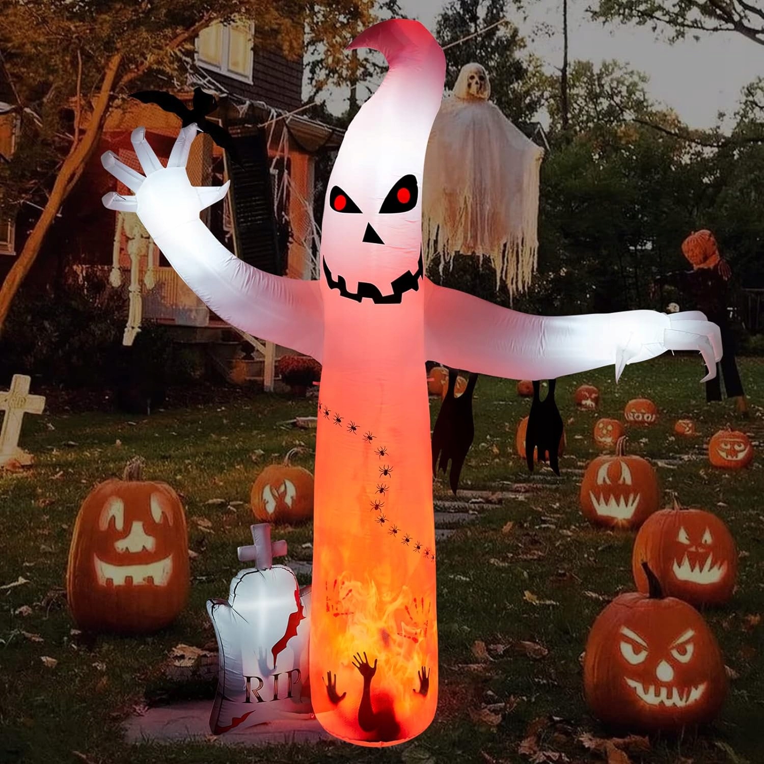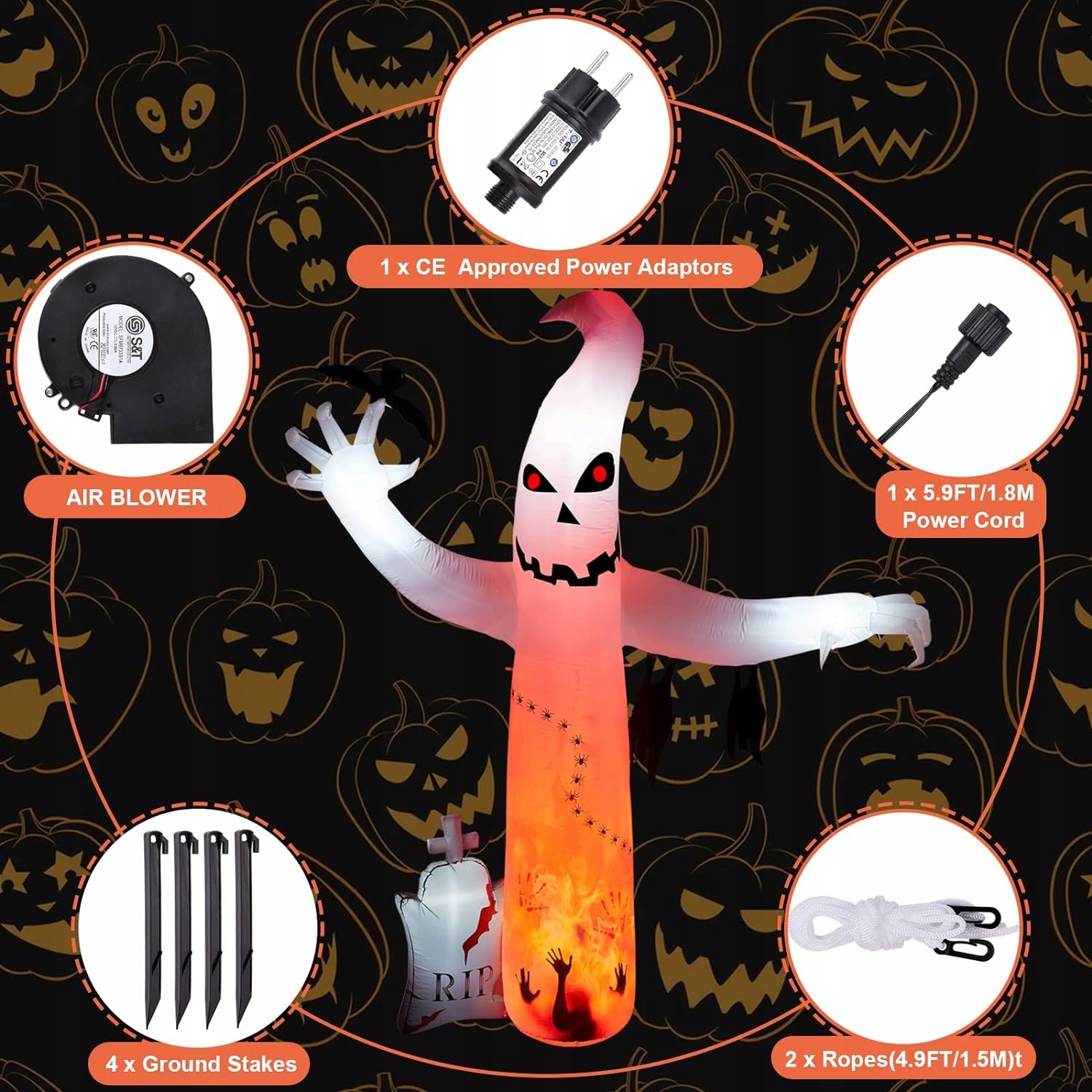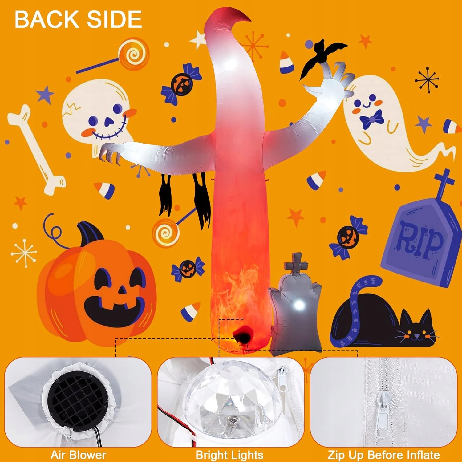 Встроенные сверхяркие светодиоды и вентиляторы делают украшение видимым уже через минуту после подключения. Это делает его пригодным для использования как в помещении, так и на открытом воздухе, создавая атмосферу Хэллоуина.