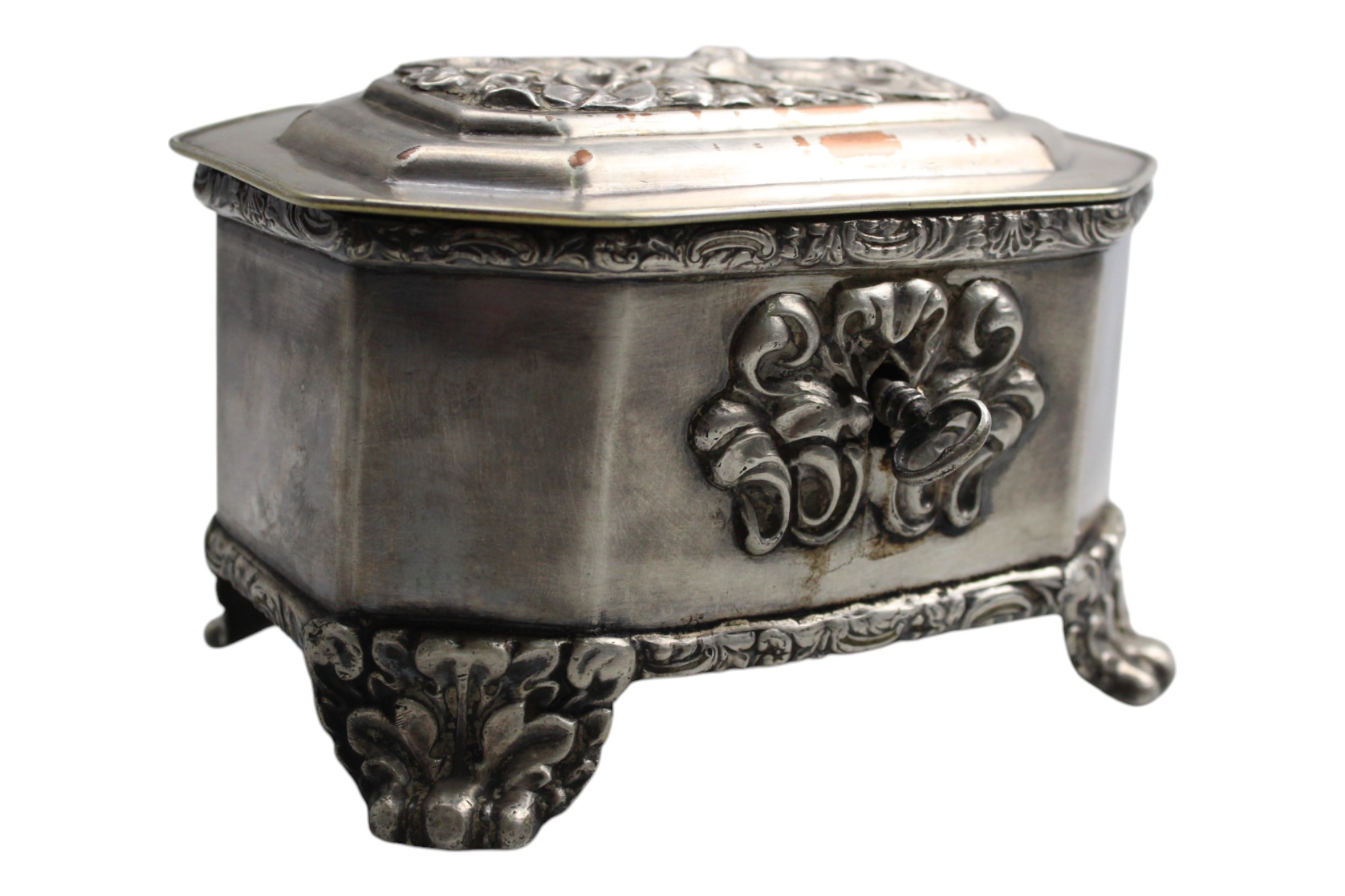 Конфеты с восьмиугольной формой, поддерживаемые четырьмя стилизованными акандами. Крышка, украшенная богатым цветочным орнаментом (листья, цветы и фрукты), повторения в методике общения база. На передней панели замок с ключом, окруженный богато стилизованным орнаментом Rocaille. Позолоченный интерьер - так называемая гальваническая позолочка - типичная для роскошных продуктов с конца девятнадцатого века.