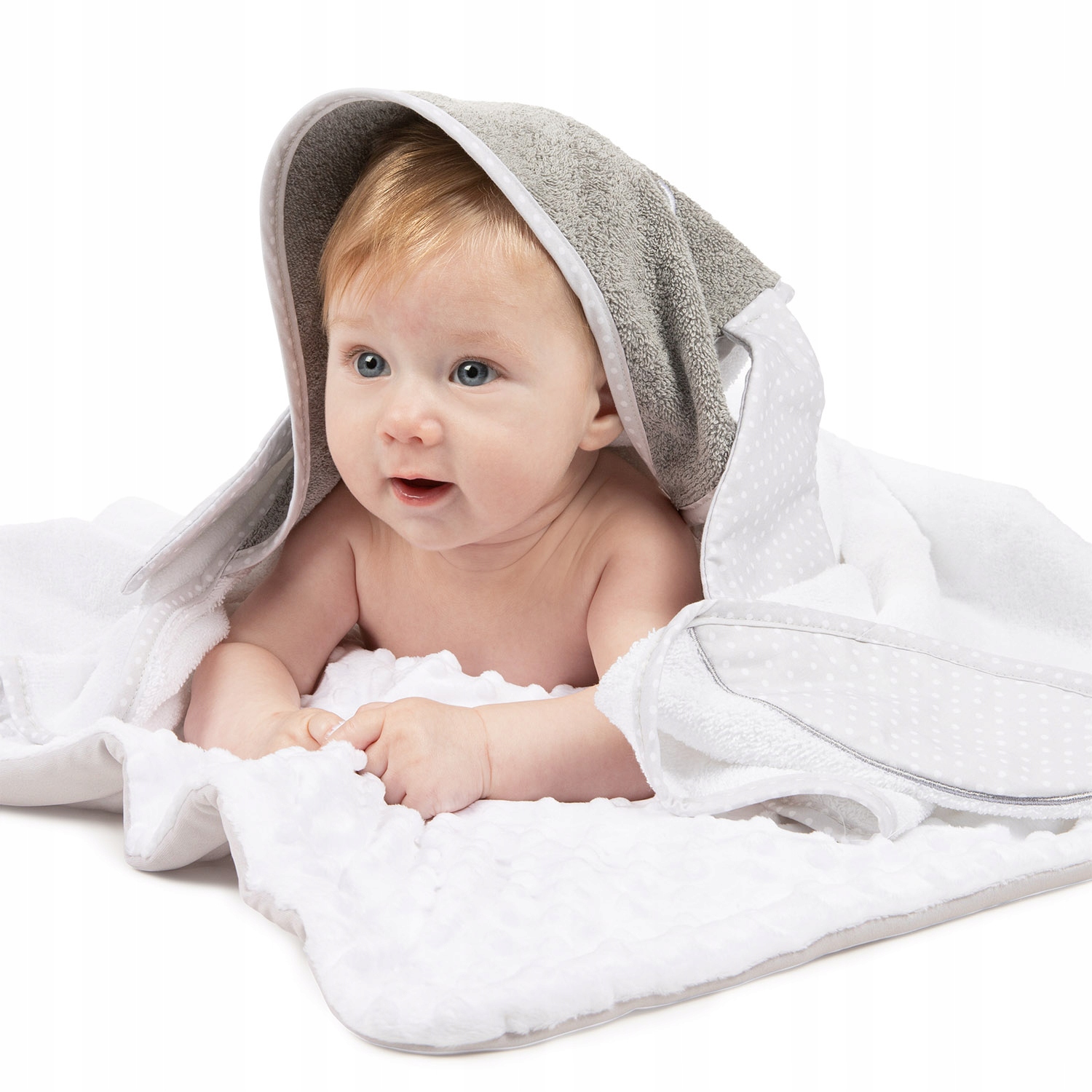 Практичное покрывало с капюшоном незаменимо во время вечернего принятия ванны. Он изготовлен из 100% хлопка, который прекрасно впитывает остатки воды и позволяет дольше сохранять тепло тела. Он мягкий и нежный, поэтому не раздражает кожу. Свободный крой не сковывает и не стесняет движений ребенка. Вшитый капюшон защищает мокрую голову от охлаждения. Размеры чехла: 100x100 см.