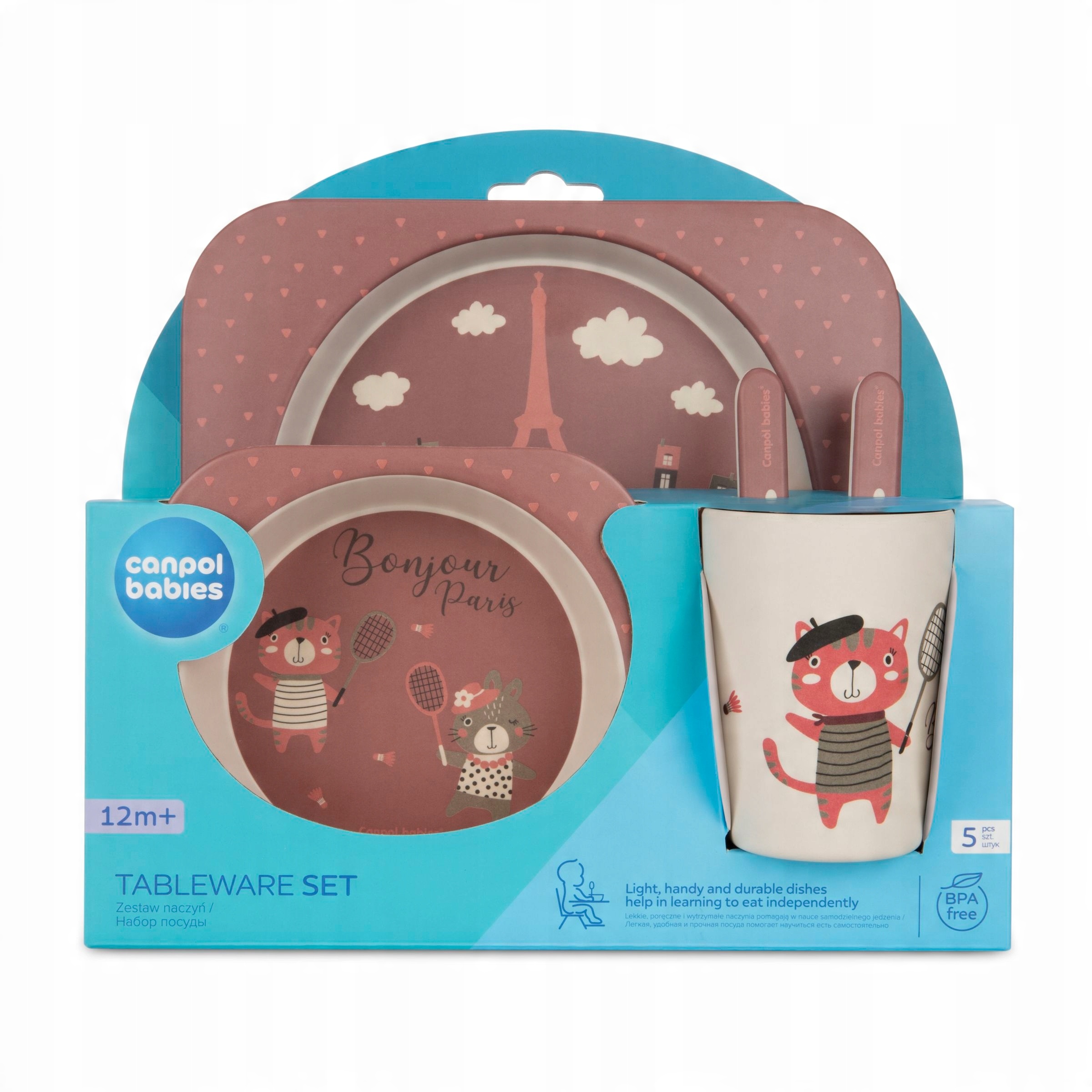 Набор посуды изготовлен из прочных, стойких, небьющихся материалов и пригоден для контакта с пищевыми продуктами, с использованием натуральных материалов. сырье: 50 % древесной муки и 30 % пищевого кукурузного крахмала (и 20 % меламиновой смолы). В комплект входят: тарелка, миска, чашка и столовые приборы – вилка и ложка. Столовые приборы имеют закругленные края, что делает их безопасными для полости рта ребенка и нежных десен. Бежевый комплект детской посуды BONJOUR PARIS с милыми принтами побудит вашего ребенка к приему пищи. Набор посуды Canpol baby идеально подходит для детей старше 12 месяцев, которые учатся есть и пить самостоятельно. Его можно мыть в посудомоечной машине, используя неокрашенные кубики и деликатные чистящие средства. Набор детской посуды BONJOUR PARIS идеален для использования дома, на отдыхе или во время пикника.
