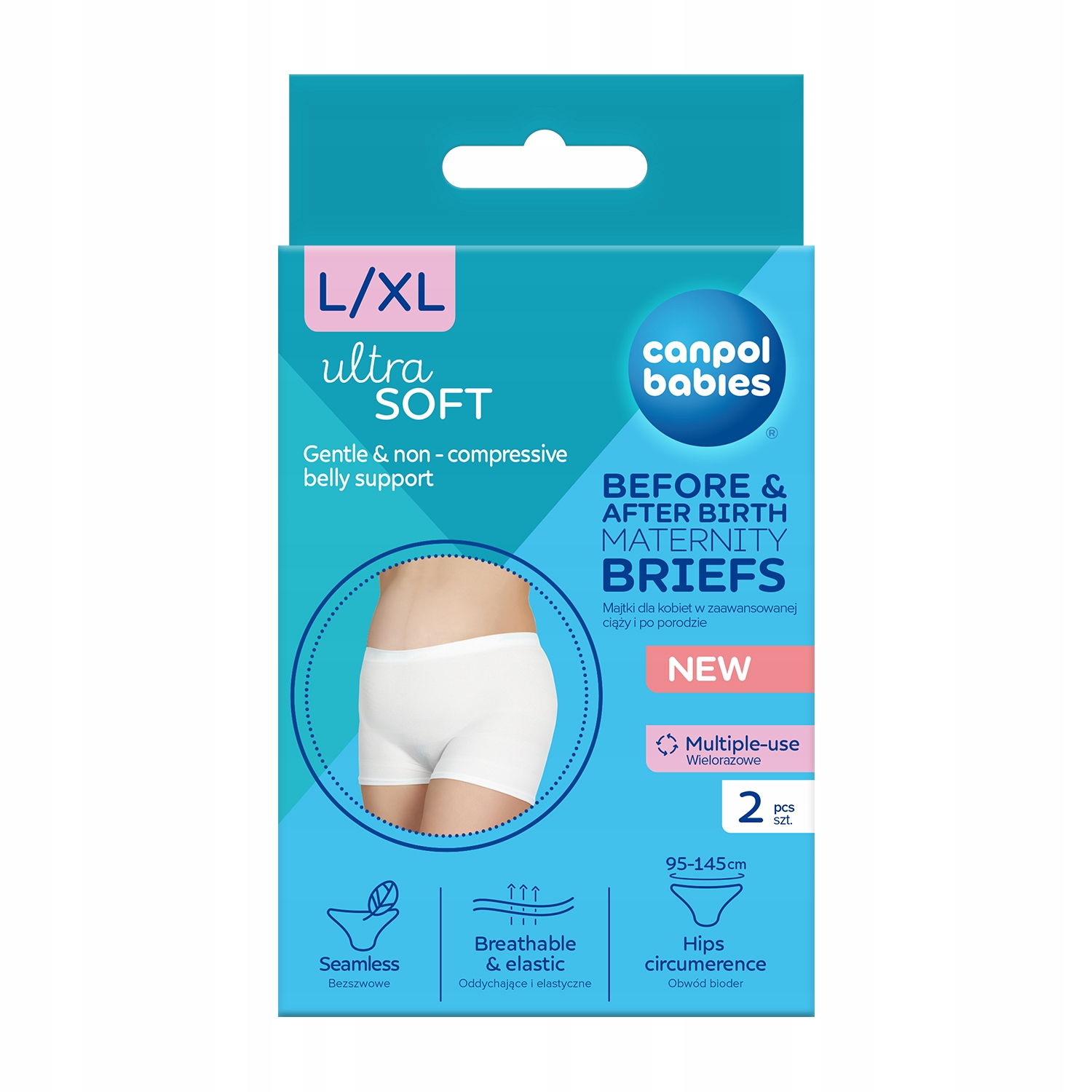 Мягкие, гибкие и очень эластичные - идеально прилегают к животу, не сдавливают, поэтому идеально подходят будущим мамам во всем. беременность и после родов. Они поддерживают живот без дискомфорта и натирания. Они не раздражают кожу и позволяют воздуху свободно проходить. Незаметные, незаметные под одеждой, они обеспечивают комфорт в течение всего дня. Послеродовые трусики Canpol baby прекрасно удерживают послеродовую прокладку на месте, обеспечивая комфорт использования. Соответствующее послеродовое белье облегчает и ускоряет заживление ран как после физиологических родов, так и после кесарева сечения. Завышенная талия трусиков щадит шрам от кесарева сечения. Трусики для беременных Canpol baby многоразовые и их можно стирать вручную. В упаковке 2 штуки. Размер L/XL подойдет женщинам с обхватом бедер от 95 до примерно 145 см.