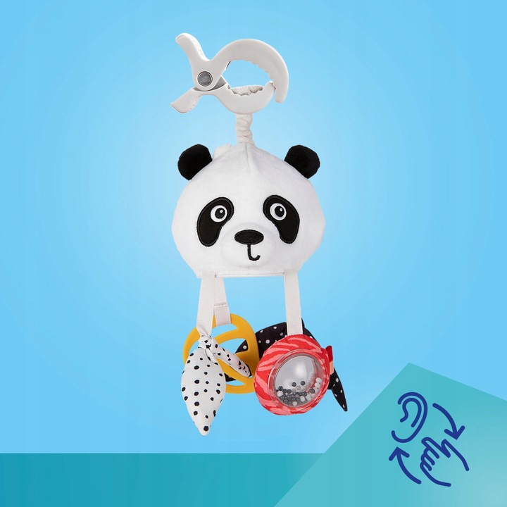 Четко очерченная контрастная мордашка панды, приятные звуки погремушки, прорезывателя и большого зеркала привлекают и поддерживают развитие чувств ребенка.