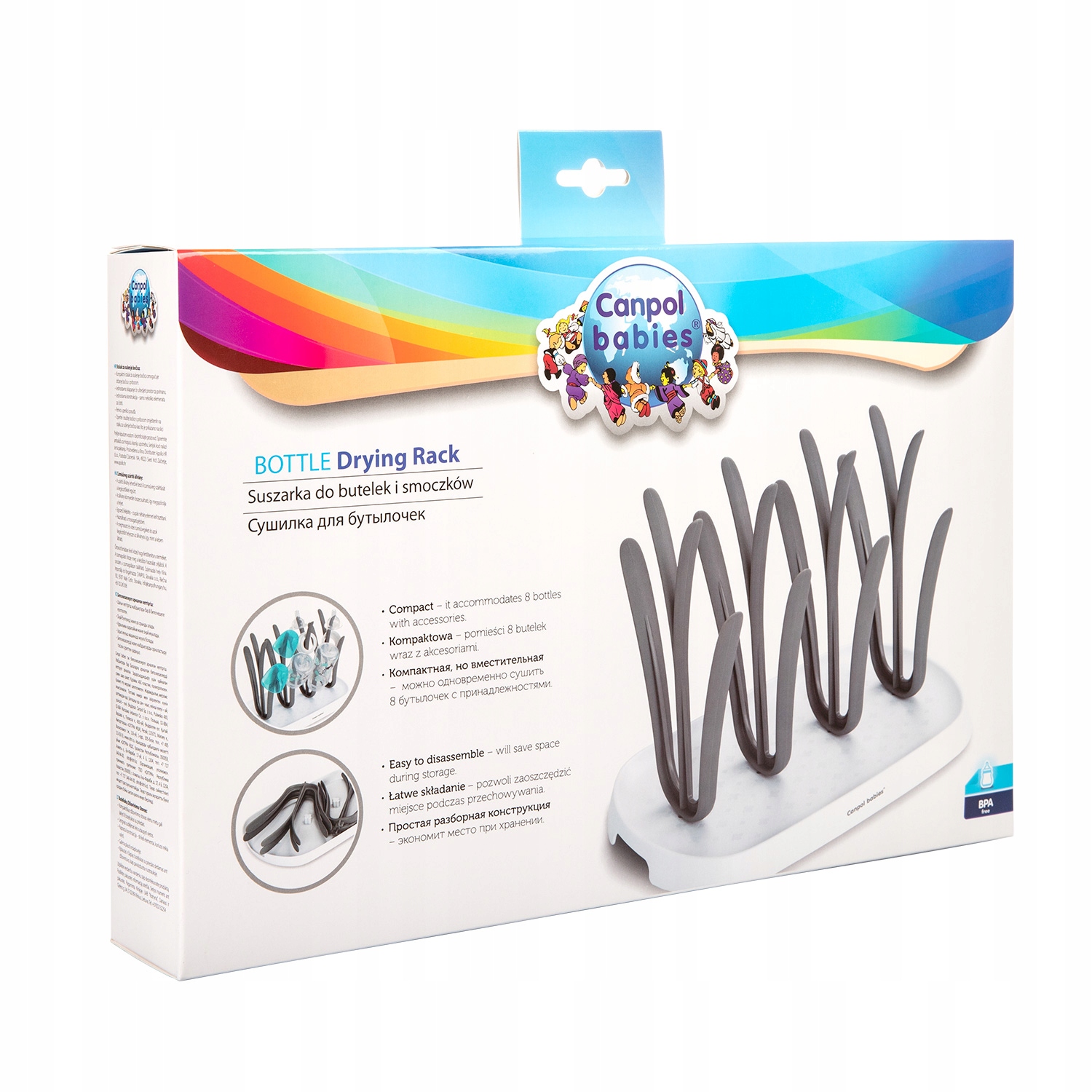 Сушилка для младенцев Canpol рассчитана на 8 бутылочек и аксессуаров. Благодаря подвижным вилкам он легко складывается и занимает мало места. Он также легкий, удобный и его легко содержать в чистоте.