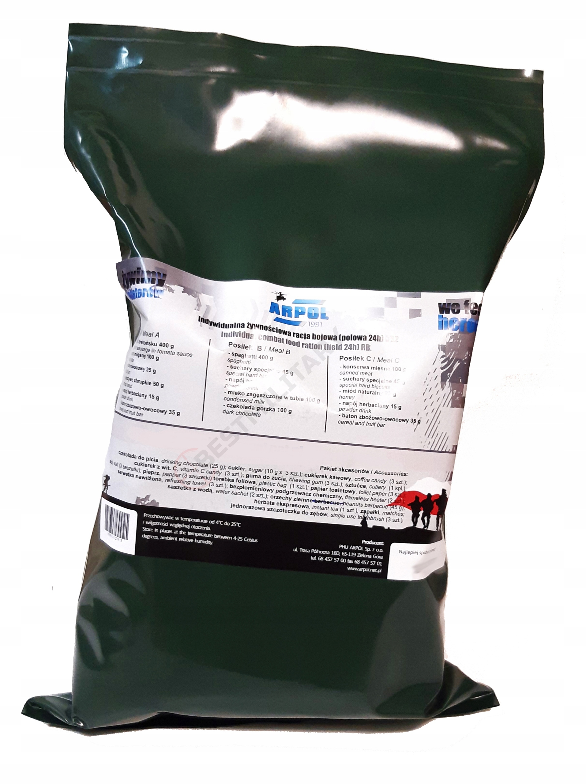 Просматривая «CAŁODZIENNA RACJA ŻYWNOŚCIOWA RACJA MRE 24h RB3» данный товар из каталога «Мясные блюда» вы можете быть уверены, что после оформления заказа, доставки в Украину, вы получите именно то, что заказывали, в оговоренные сроки и европейского качества.