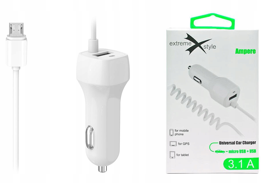 USB -автомобильное зарядное устройство с микро -USB -спиральным кабелем - 3.1a - Universal