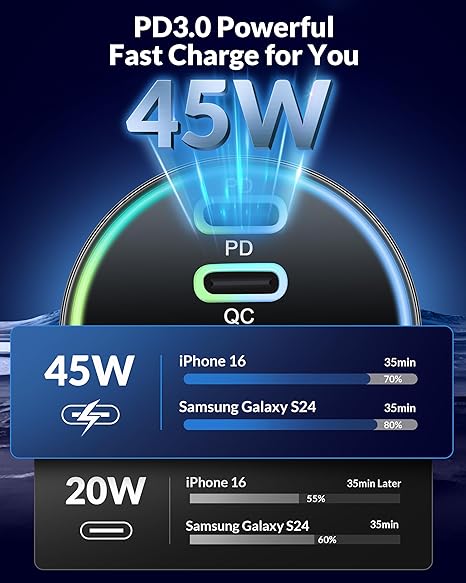 - Супер быстрая зарядка: адаптер автомобильного зарядного устройства с совершенно новой улучшенной технологией быстрой зарядки PD/PP/PPS/QC, вы можете быстро заряжать свой мобильный телефон/iPad/Mac Book. Зарядка iPhone 16/15/14 до 70% и сериал iPad до 60% всего за 30 минут. Зарядка для серии Samsung Galaxy S24/S23/S22 для серии до 80% и большинства устройств Android до 60% за 35 минут