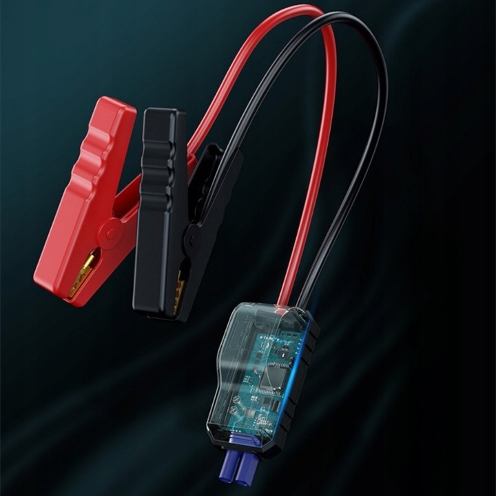 - Устройство также имеет дисплей и может работать как фонарик. В комплект входят зажимы для автомобильного аккумулятора и кабель USB - Type-C.