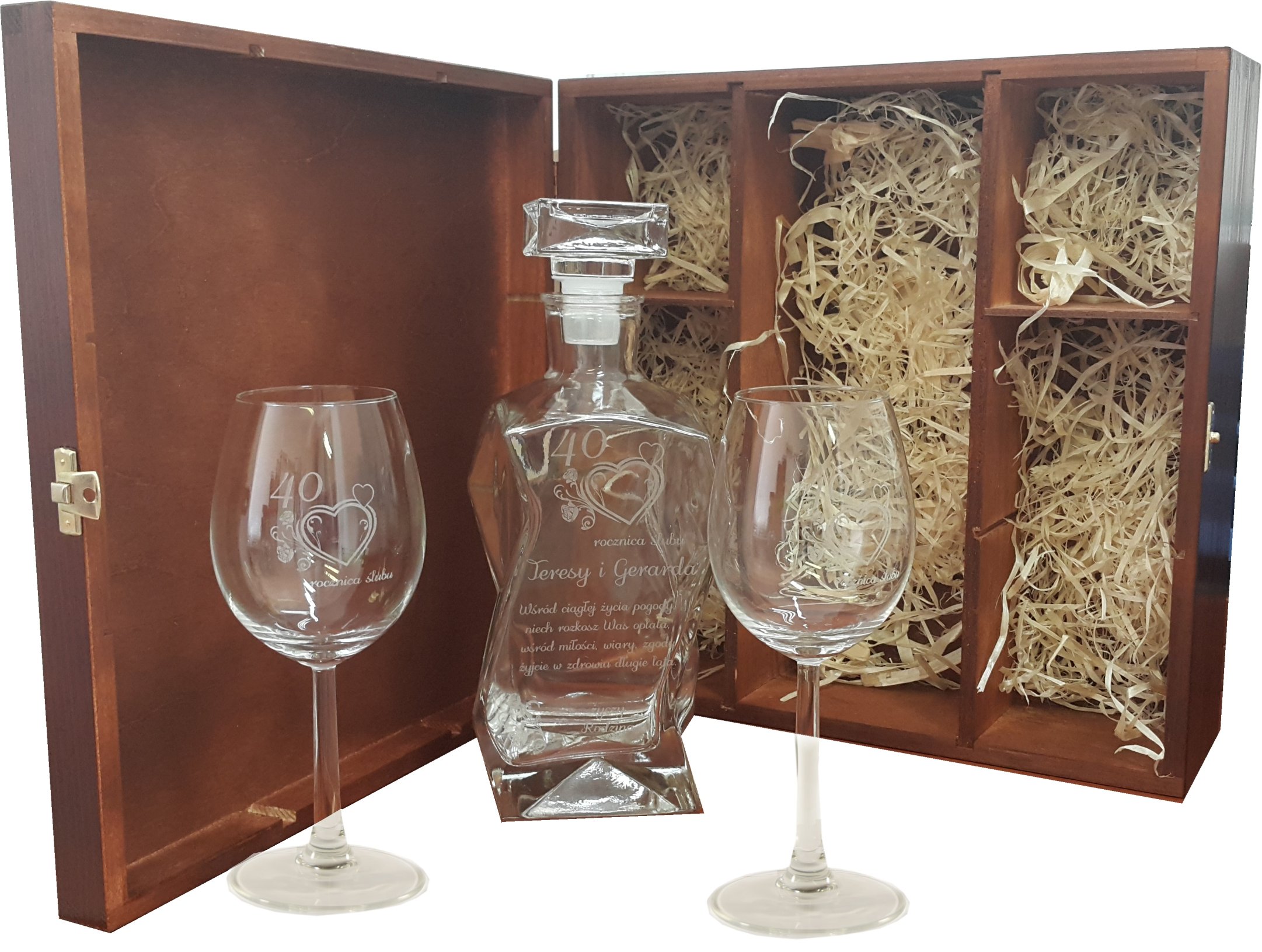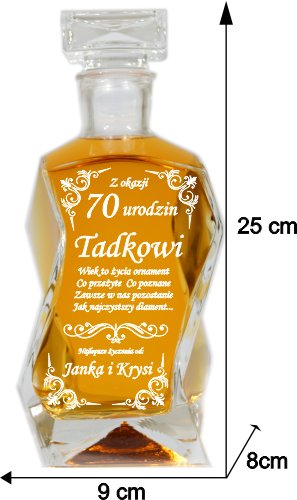 уникальный графин с лазерным украшением с двумя очками 330 мл, помещенного в декоративную деревянную коробку. Емкость Carafe составляет 0,75 л. Идеальный подарок для каждого случая. Рука польского продукта, которая может привести к пузырькам воздуха в стеклянной структуре. Маленькие сладости, небольшой подарок или, может быть, обручальное кольцо для любимого