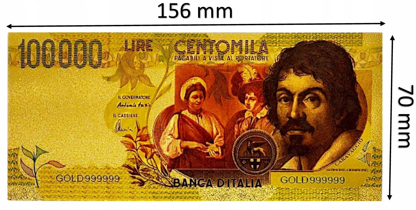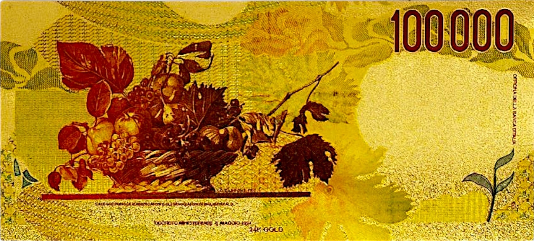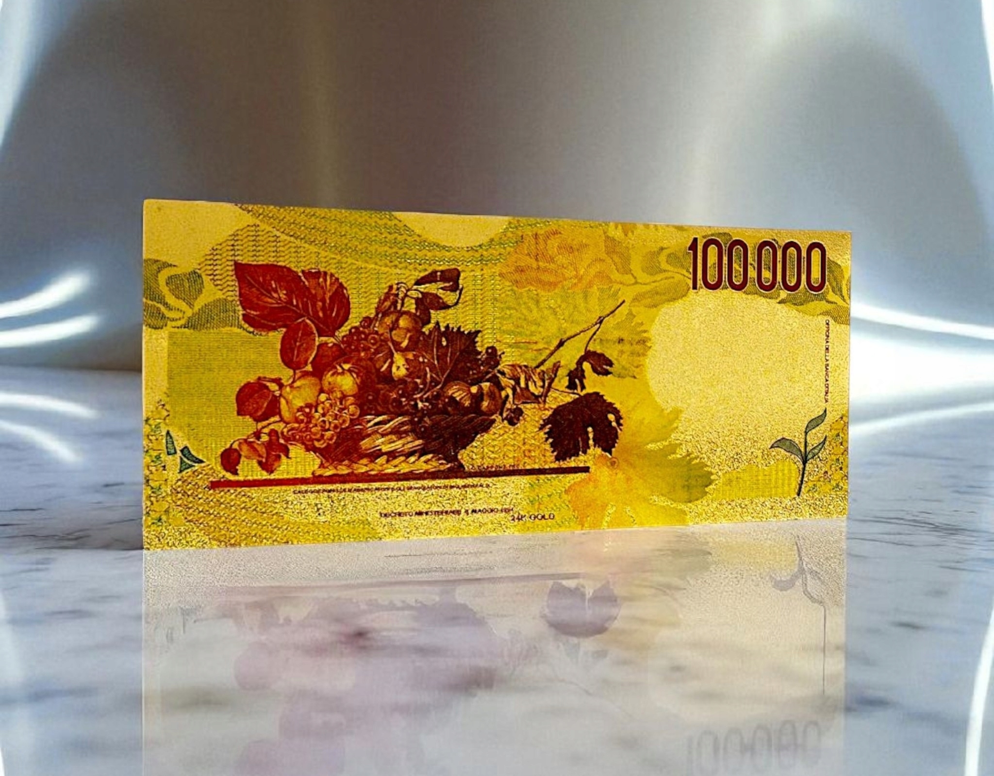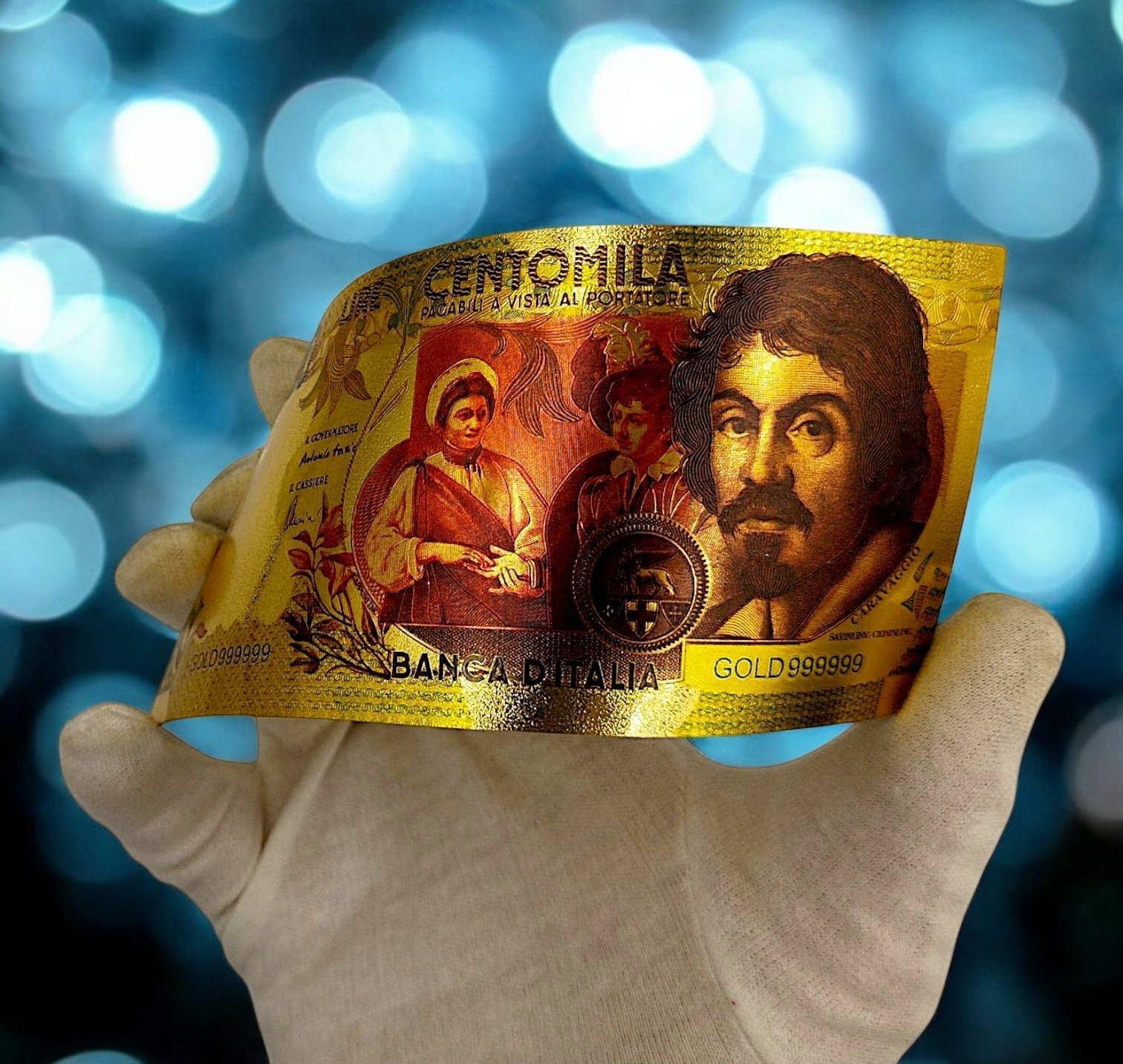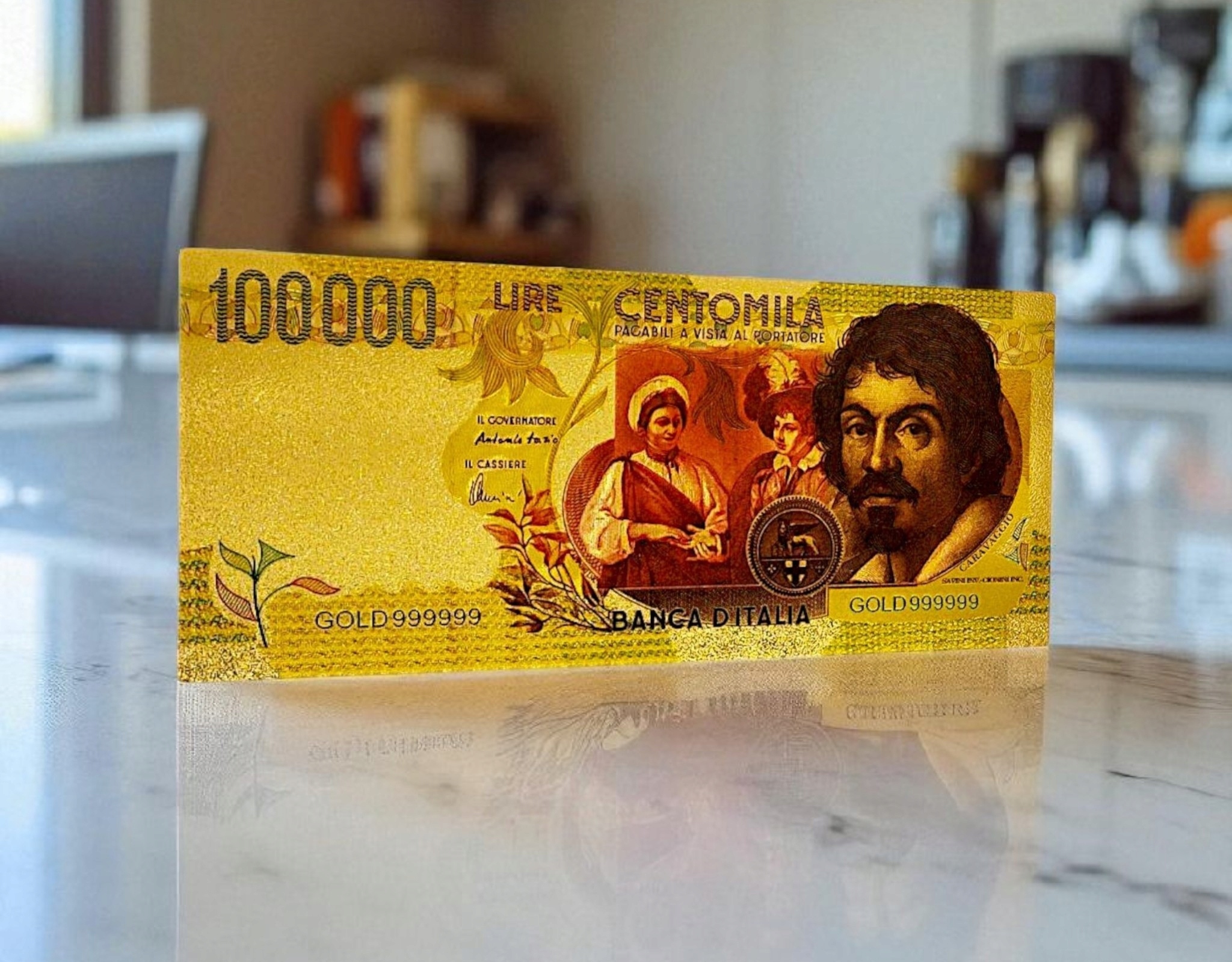Позолоченная коллекционная банкнота 100 000 лир КАРАВАДЖО из ПВХ в подарок