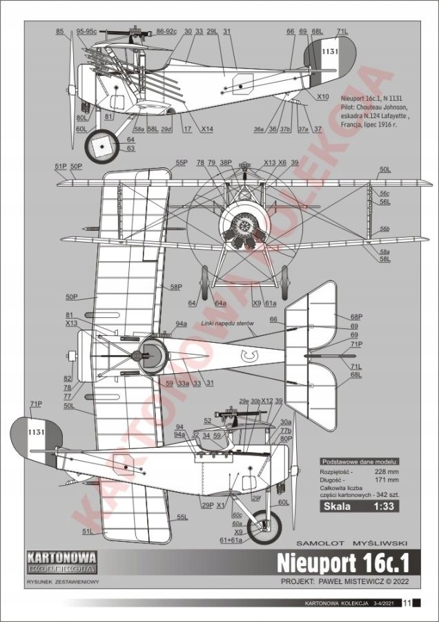 Журнал «Картонова коллекция»с картонной моделью французского истребителя Nieuport 16c.1 времен Первой мировой войны. На нем изображена машина знаменитой эскадрильи N.124 «Лафайет», пилотируемая американскими добровольцами. Модель средней сложности конструкции имеет разделенные поверхности управления (элероны, рули направления), богатое оборудование кабины, сравнительно большое количество деталей и вооружение в виде неуправляемых ракет Ле Приера.