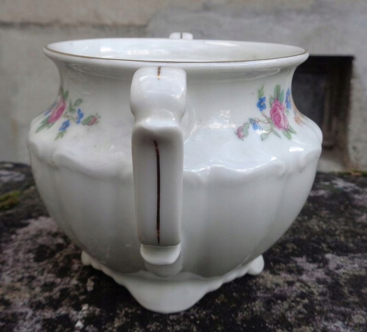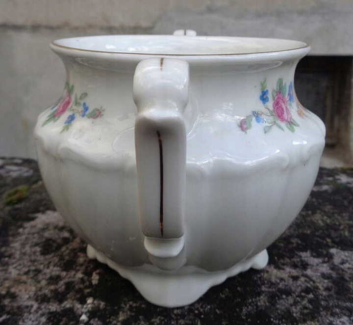 Интересная, богато декорированная сахарница фабрики Carl Tielsch, изготовленная в 1960-х годах. Экспонат поддерживается четырьмя богато декорированными ножками интересной формы. Чаша сахарницы украшена интересными выступами из фарфора. Сверху чаша украшена интересным натуралистичным орнаментом из фарфора. Сверху сахарница украшена интересными красочными цветочными узорами. Экспонат имеет интересные, декоративные ручки, расписанные вручную золотом. Край сахарницы также декорировался вручную. Очень качественный фарфор цвета слоновой кости. У сахарницы отсутствует крышка. Экспонат не имеет повреждений. Подписано, подпись видна на фотографиях. Всем рекомендую.