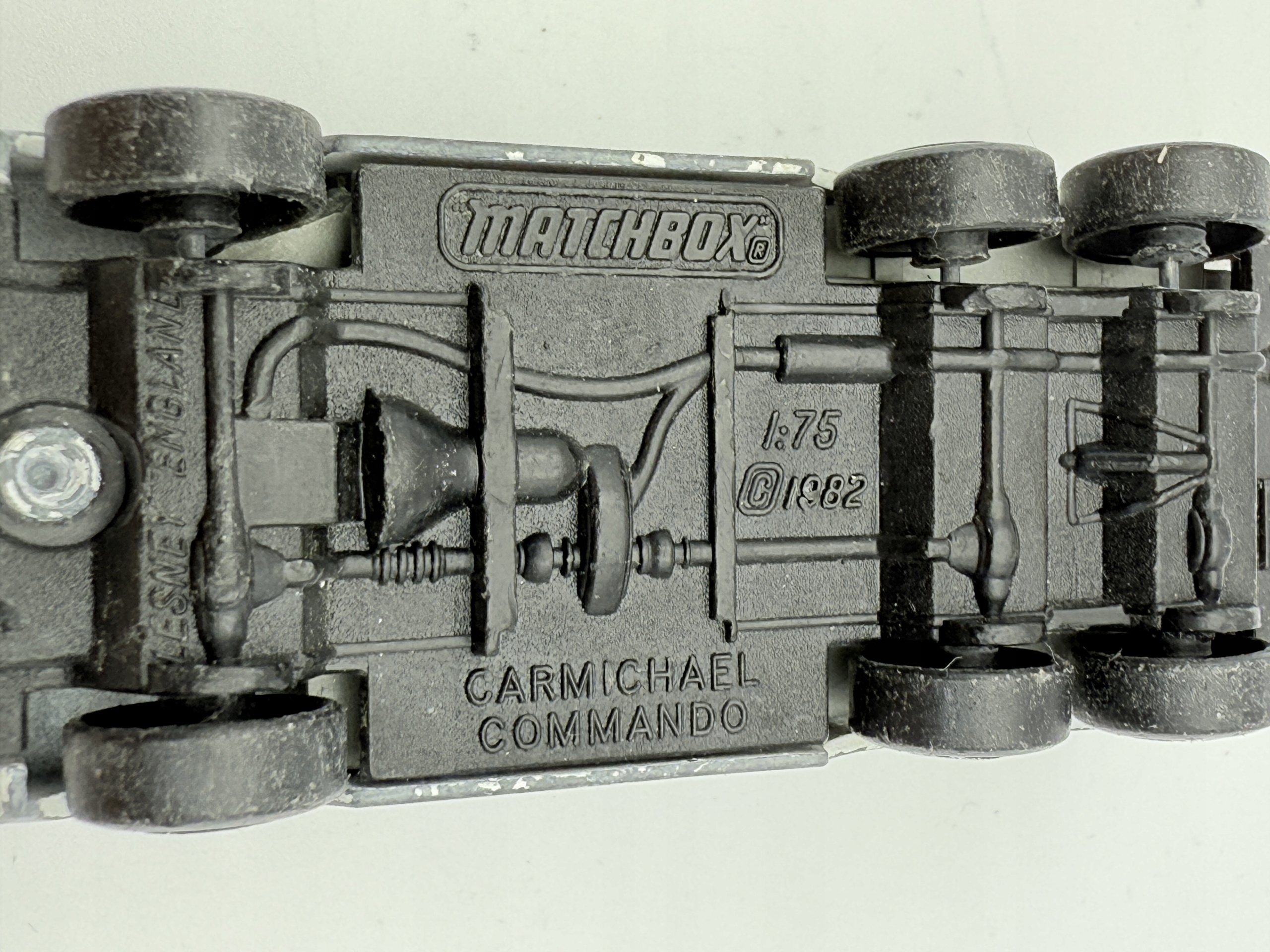 - Модель: CARMICHAEL COMMANDO, Спичечный коробок 1982 г., Сделано в Англии, Литье под давлением, Белый 1:75