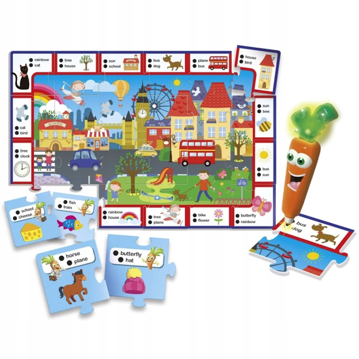 Во время игры дети изучают основы английского языка с помощью счастливой морковки, которая мотивирует детей учиться радостными криками за правильный ответ. Просто коснитесь черной точки рядом с ответом кончиком ручки. Также можно поиграть в поиск элементов из кадра на средней картинке.