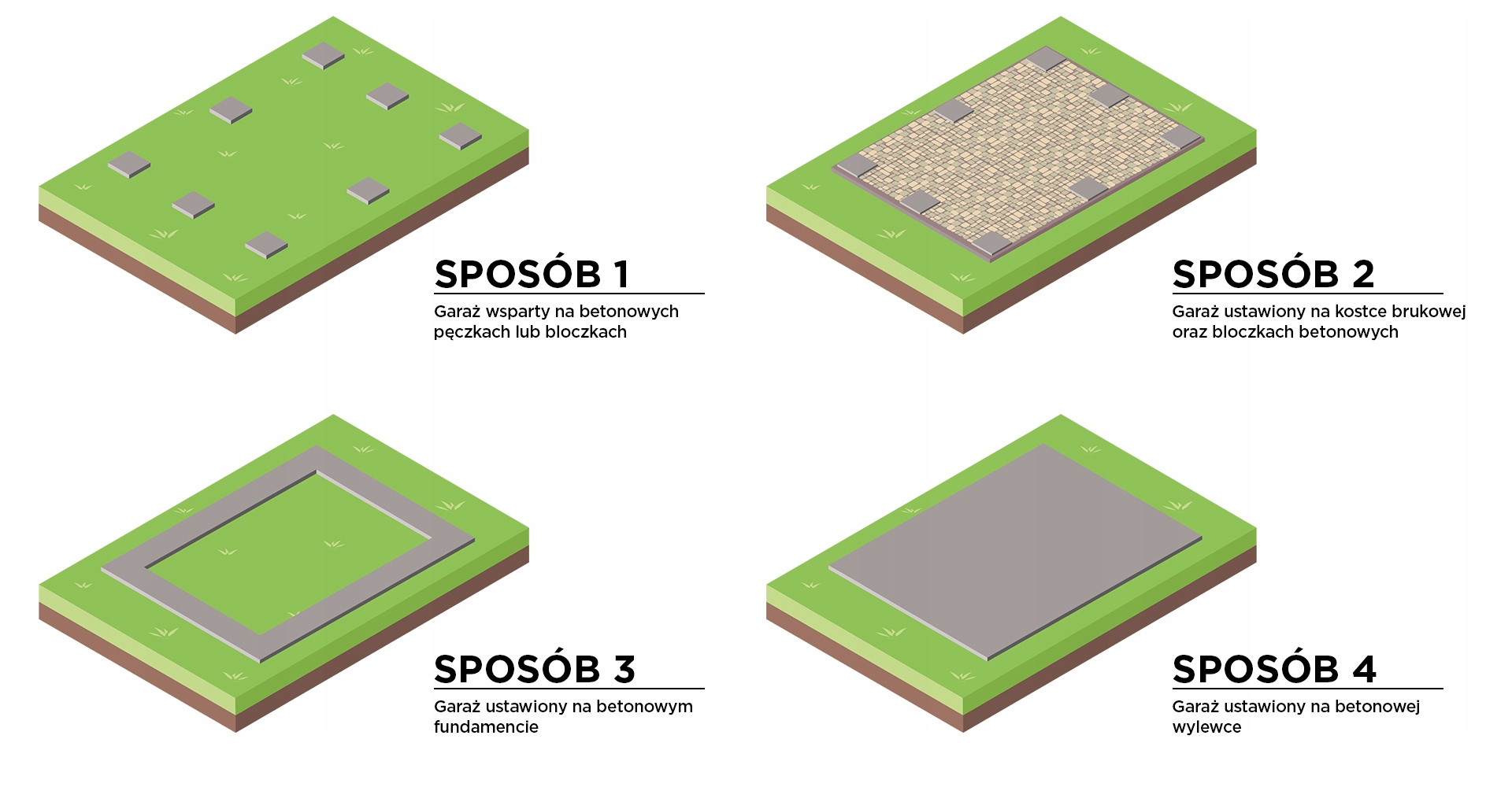 Фокал может быть ПВХ труб. Они должны вырыть в землю и залить бетоном. Глубина фундаментов должна зависеть от уровня грунтовых вод, однако стандартная и наиболее распространенная глубина составляет не менее 30 см. Мы рекомендуем возбуждение (прикручивание) гаража в бетон.
