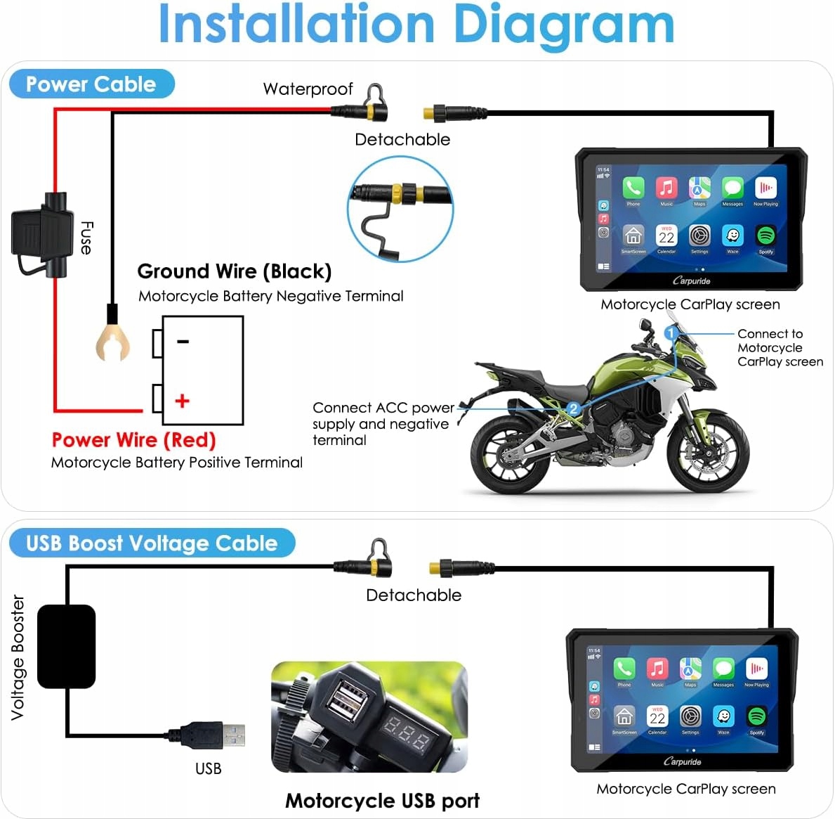 В комплект входят U-образные и квадратные кронштейны, винтовая система, все предназначено для мотоциклов - подходит для большинства моделей. Прямая проводка: +12 В (ACC) и земля. Также поддерживается через порт USB с повышением напряжения 5–12 В (минимум 2,5 А).