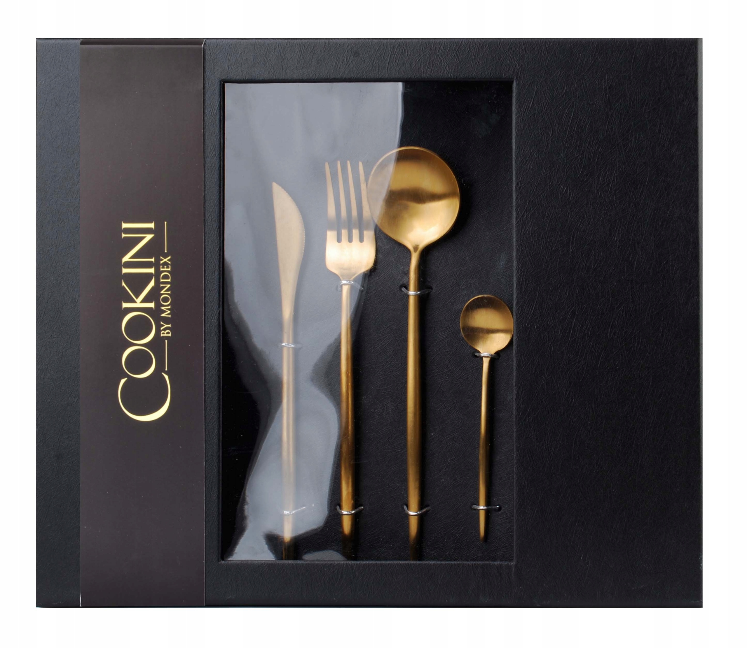 Набор золотых столовых приборов из коллекции CASA GOLD. Матовый финиш. Они идеальны в качестве подарка. Состоит из 16 элементов, 4 столовых ножей, 4 вилок, 4 десертных/коктейльных ложек и 4 суповых ложек.
