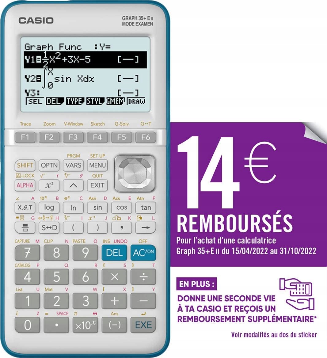 - пункт списка: CASIO Graph 35+E II N°1* в средней школе, 8 лет -строчный дисплей с естественным двухмерным письмом, Новый, более тонкий и эргономичный дизайн для лучшего захвата, НОВИНКА: Регулярные обновления ОС для добавления новых функций, Программирование на Python, поставляется с руководством пользователя только на французском языке, Язык программного обеспечения отображается только на экране, соответствует рекомендациям для использования экзаменов министерств образования Франции, нет аккредитации/разрешения на использование экзаменов министерств образования любой страны/государства за рубежом. Франция