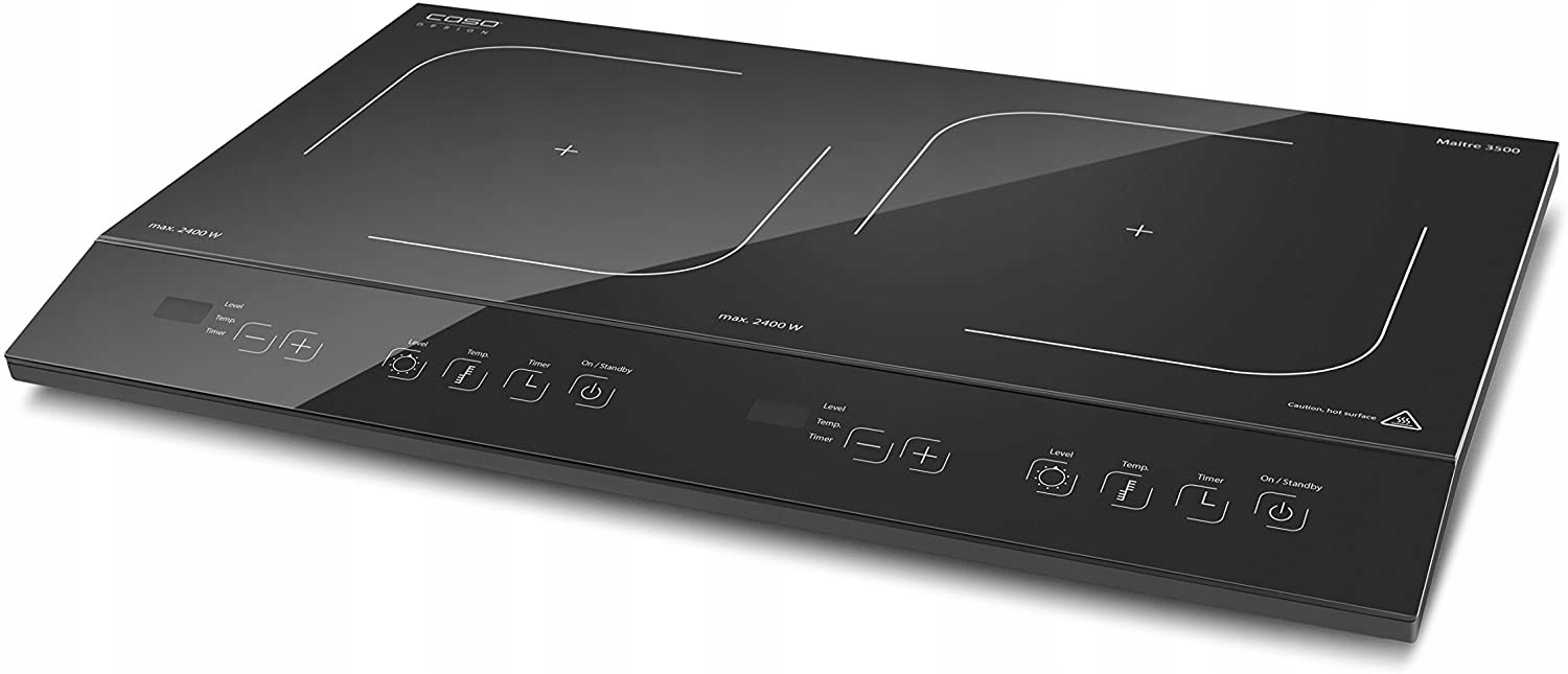 Caso Maitre 3500 — современная варочная панель с двойной индукцией, которая благодаря мощности 3500 Вт и технологии PowerSharing гарантирует быстрое и энергосберегающее приготовление пищи. Возможность точного регулирования температуры на 12 уровнях (от 60 до 240 °C) и таймер до 180 минут делают устройство подходящим для использования на любой кухне – как дома, так и в небольших помещениях, например. в дачных домиках.