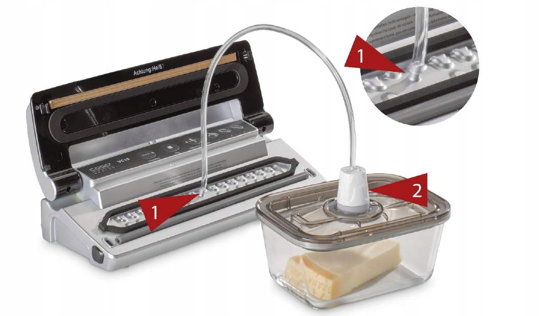 Обратите внимание на неконтролируемое повышение давления воздуха внутри контейнера, например, после вакуумной упаковки газообразующих, горячих предметов и т. д. Контейнер иначе крышка может лопнуть и повредиться.