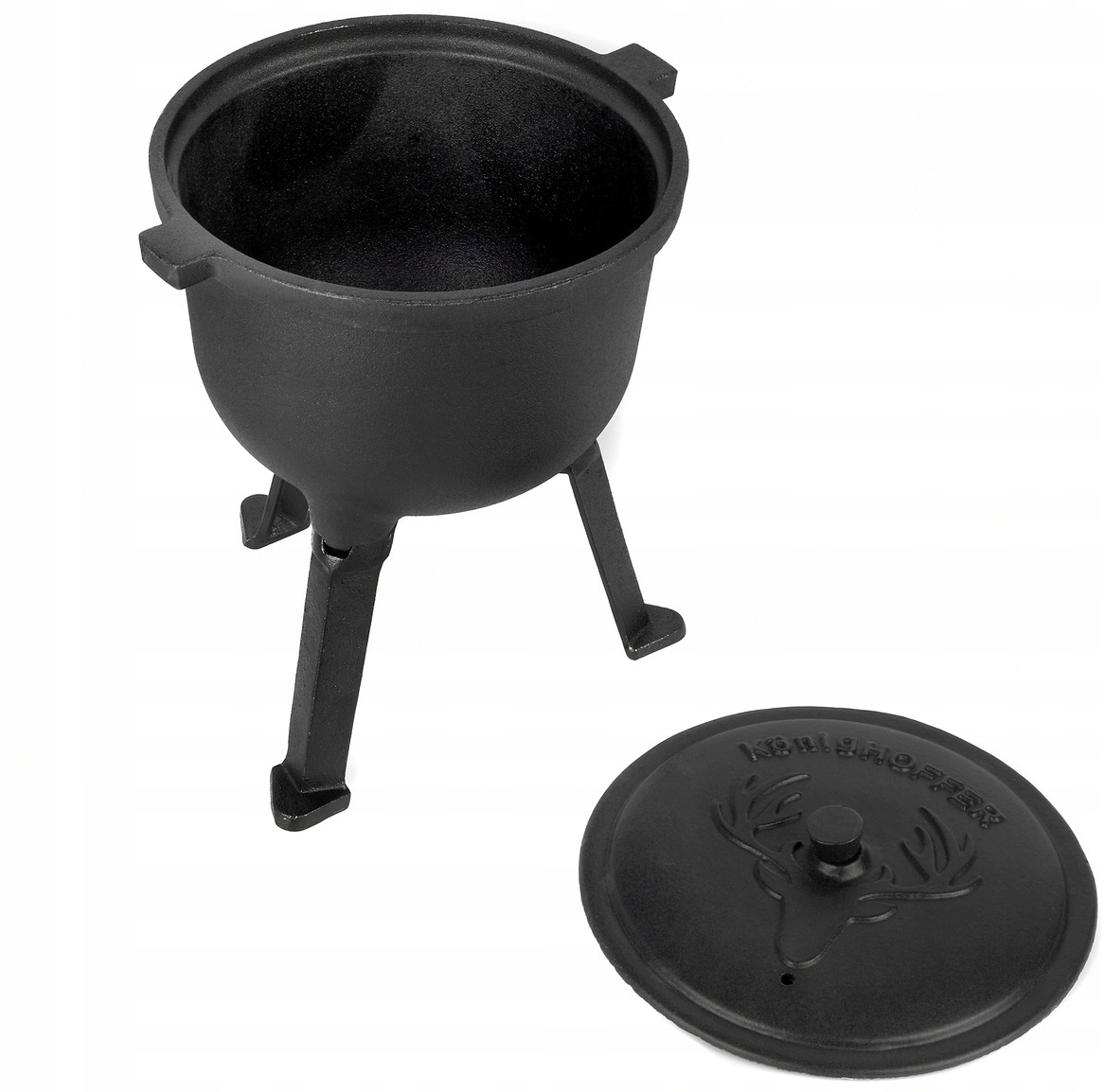 Приготовление пищи в условиях природы будет чувствовать себя комфортно с тяжелым охотничьим горшком из чугуна. Вы установите его над огнем с помощью чугунных ног. Тем не менее, приостановка котла возможна благодаря специальной ручке того же материала - это также поможет вам нести продукт.