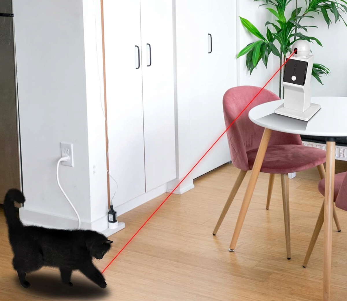Устройство совершает полный поворот на 360 градусов, заставляя лазерную точку автоматически перемещаться по всей комнате, привлекая внимание кошки и побуждая ее охотиться. Лазер действует в радиусе примерно 150 см.