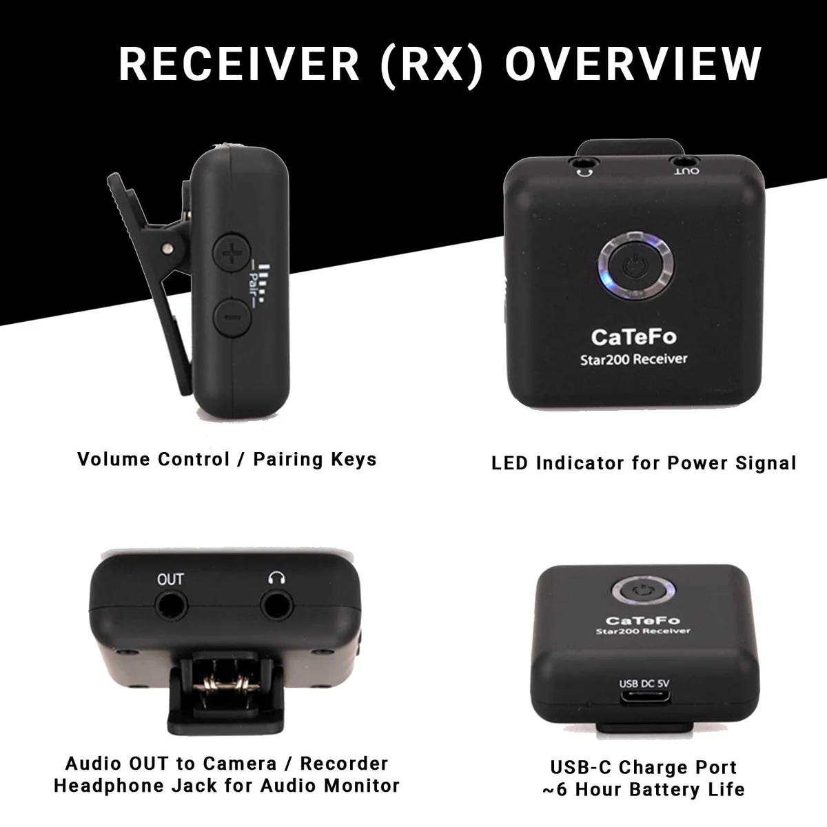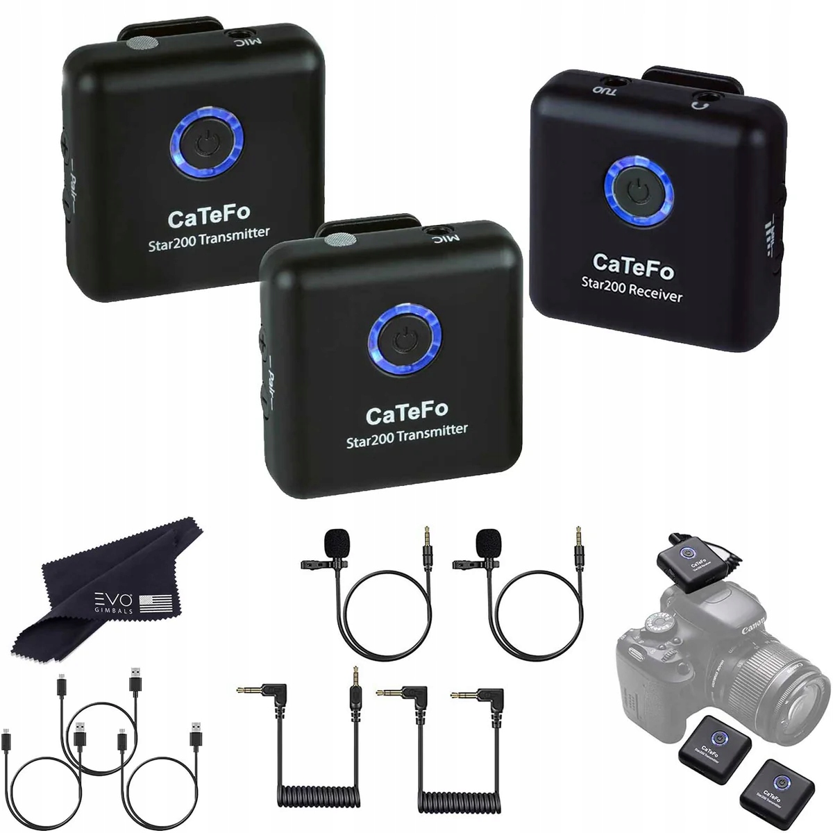 CaTeFo Star200 T1 — это двухканальная беспроводная микрофонная система нового поколения с частотой 2,4 ГГц, предназначенная для захвата звука вещательного качества для двух человек с помощью смартфона, планшета, зеркальной камеры, видеокамеры или ПК/ноутбука.