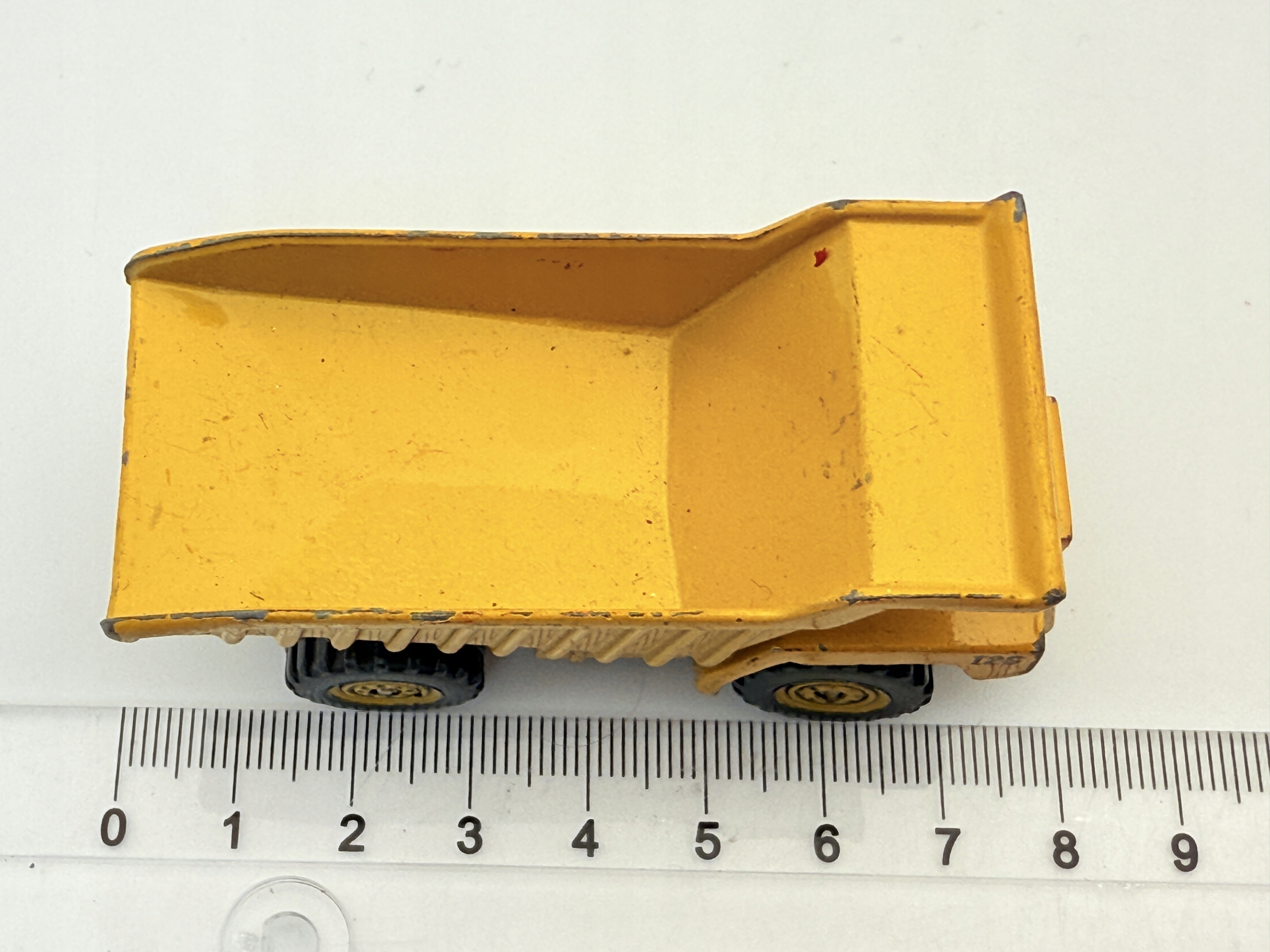 Этот автомобиль, изображающий желтый самосвал, привлекателен для коллекционеров благодаря реалистичному дизайну и функциональности подъемной грузовой платформы. Металлическая конструкция и большие черные шины добавляют ему аутентичности. Несмотря на то, что модель находится в среднем состоянии, с видимыми царапинами и небольшими повреждениями лакокрасочного покрытия, ее все равно можно оценить за надежность и детальную проработку.