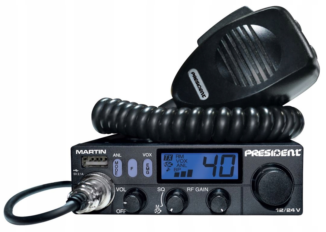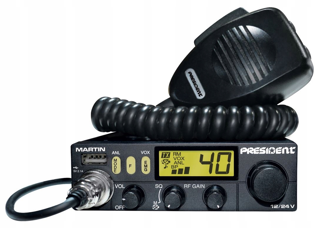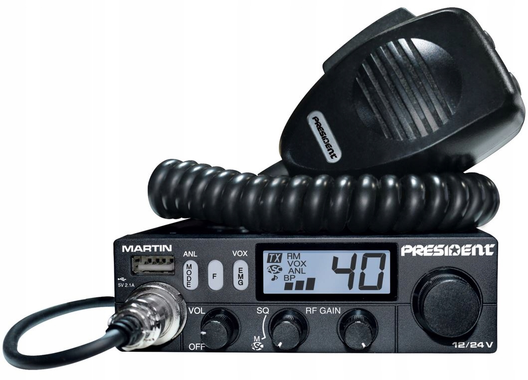 Президент CB Radio Мартин имеет встроенную систему, позволяющую питать приемник как 12 В (13,8 В), так и 24 В. Он не требует использования дополнительных преобразователей и редукторов напряжения. Эта радиостанция CB особенно рекомендуется для установки и использования в грузовике, автобусе или кемпере.