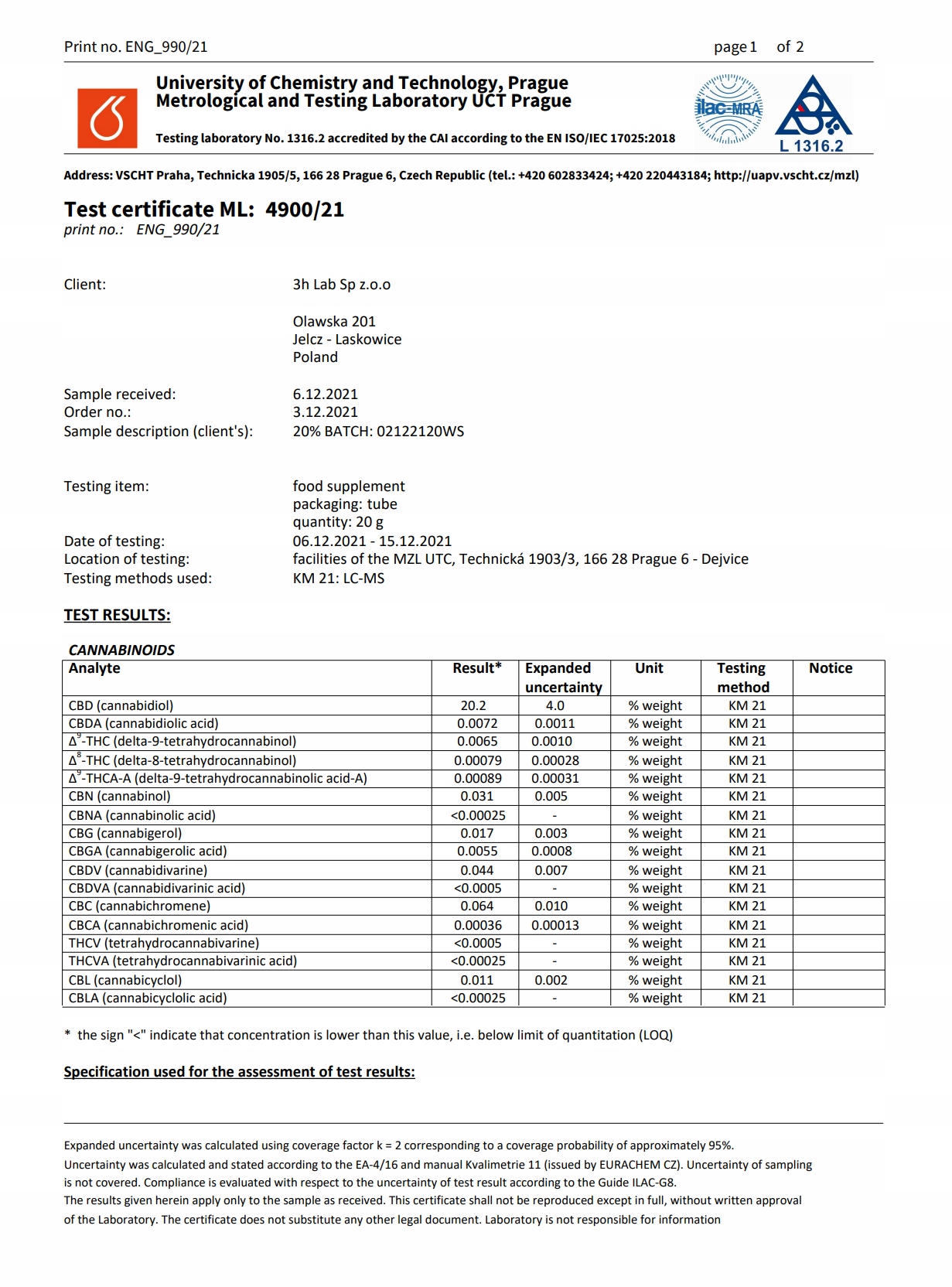 В процессе производства мы не удаляем какие-либо вещества, встречающиеся в конопле естественным путем (терпены). , флавоноиды). В дополнение к спектру каннабиноидов, таких как CBDA, CBC, CBG, CBN и т. д., наше масло содержит 2000 мг КБД и полностью очищено от ТГК. Экстракт растворен в конопляном масле BIO, которое характеризуется оптимальным соотношением жирных кислот Омега-6 и Омега-3 3:1.