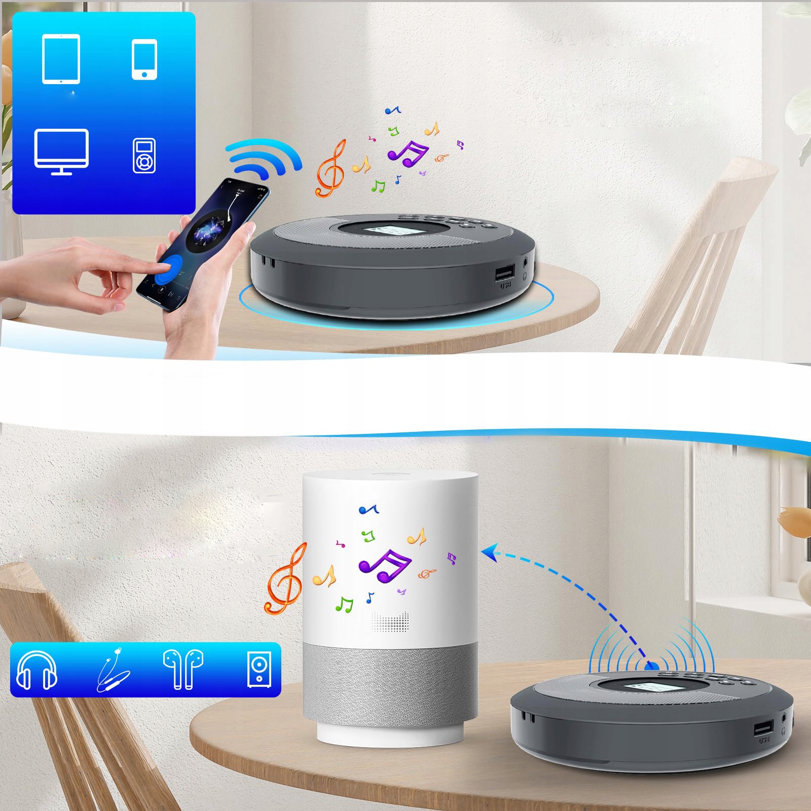 В качестве проигрывателя компакт-дисков с передатчиком Bluetooth его можно подключить к наушникам или колонкам Bluetooth.