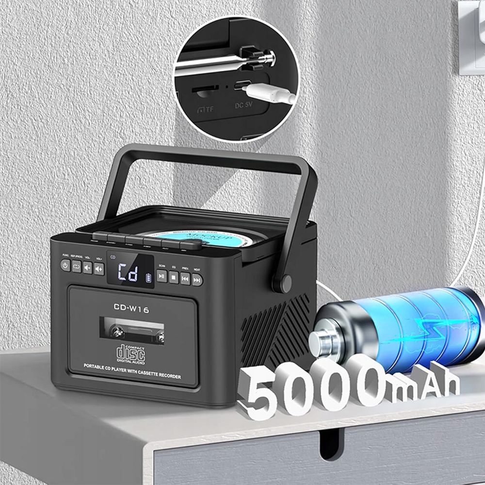 CD-плеер оснащен мощной батареей емкостью 5000 мАч, которая обеспечивает до 5 часов работы после 10 часов зарядки через кабель Type-C 5 В/2 А. Этот проигрыватель компакт-дисков подходит для использования как в помещении, так и на открытом воздухе. и снаружи. Забудьте о необходимости замены батарей и наслаждайтесь непрерывным воспроизведением музыки в любое время и в любом месте.