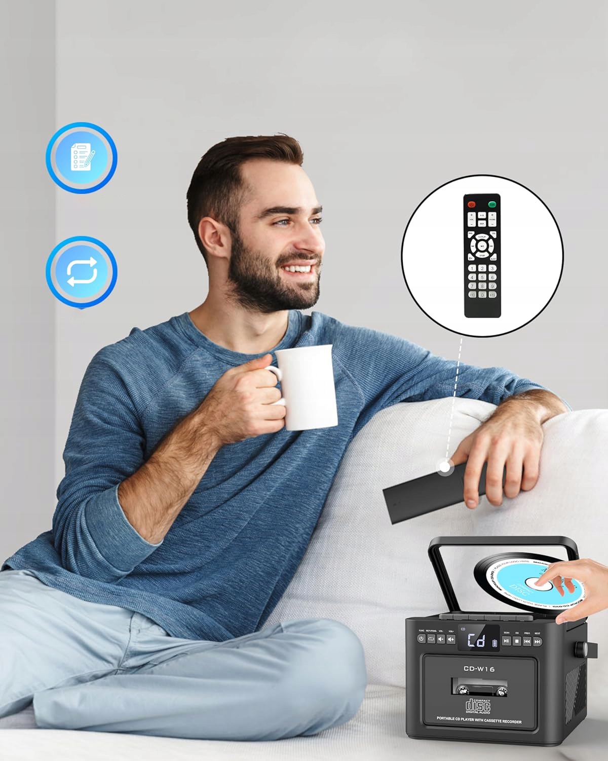 Этот проигрыватель компакт-дисков с поддержкой Bluetooth предлагает удобные возможности настройки и управления. В режиме CD вы можете создавать свои собственные списки воспроизведения с помощью функции программирования, а функция повтора обеспечивает неограниченное наслаждение музыкой. В кассетном режиме можно записывать музыку в других режимах с чистых кассет. Кроме того, благодаря функции программирования FM-радио вы можете легко сохранять и воспроизводить любимые станции.